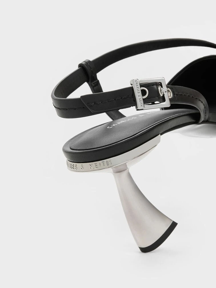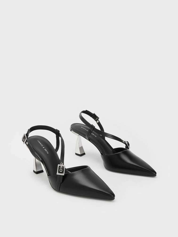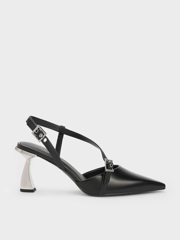 Navigate the delicate balance between edgy and elegant with these chic slingback pumps. Boasting a streamlined pointed-toe silhouette and a minimalist asymmetrical strappy design, these shoes will bring any look together while offering an interesting visual element. Additionally, the tastefully designed curved heels and petite metallic buckles enhance these shoes with an extra touch of sophistication.