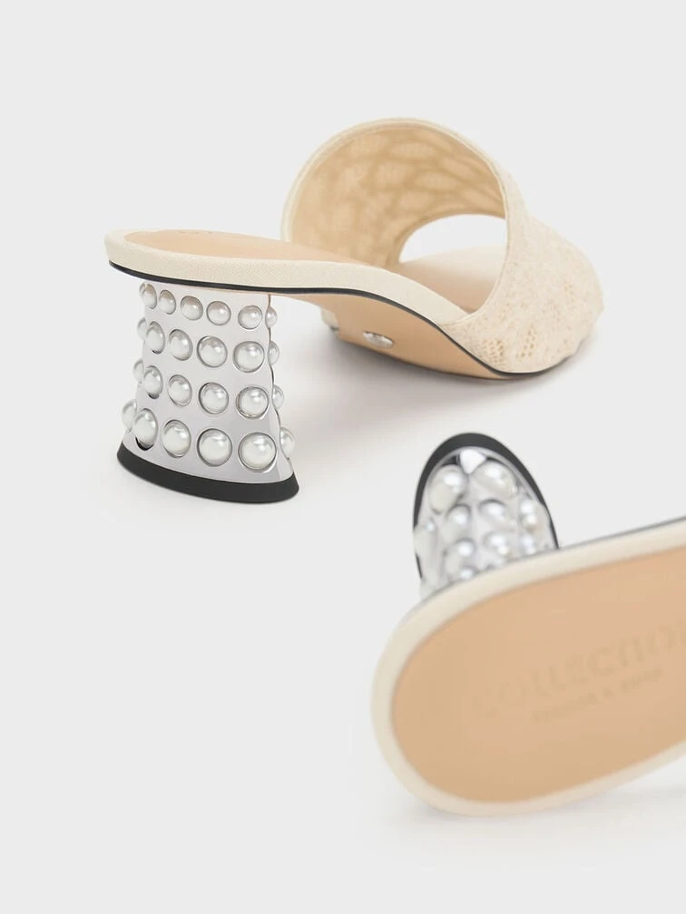 When you have a pair of mules as stylish as this, you will be able look and feel elegant and feminine with ease. Crafted from a soft blend of crochet and mesh, the straps will be comfortable on your feet even when you wear them all day. Complete with eye-catching metallic beaded heels, these shoes are certain to wow the crowd wherever you go.