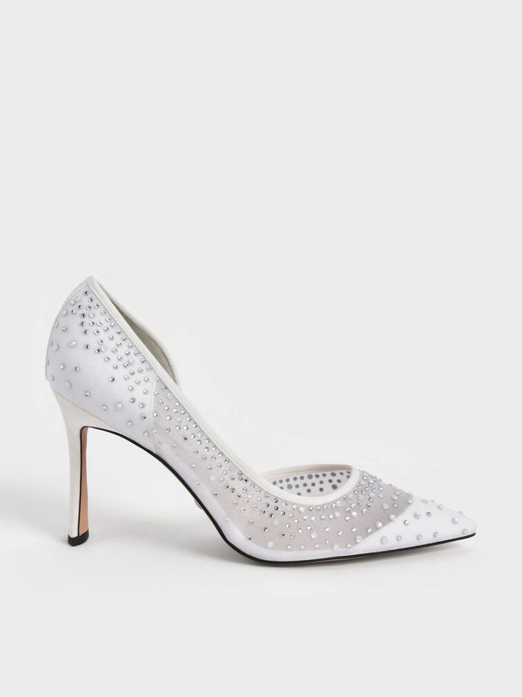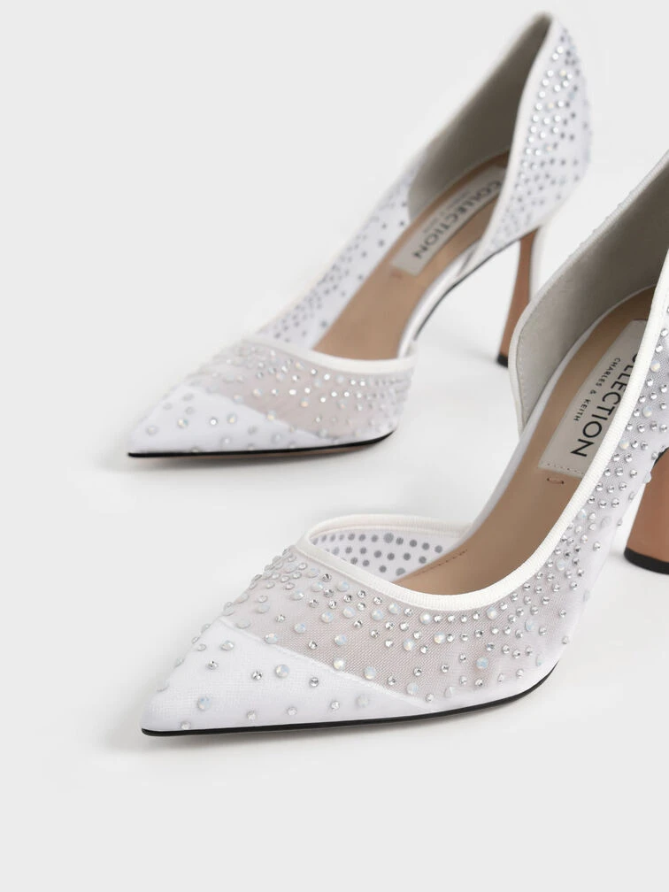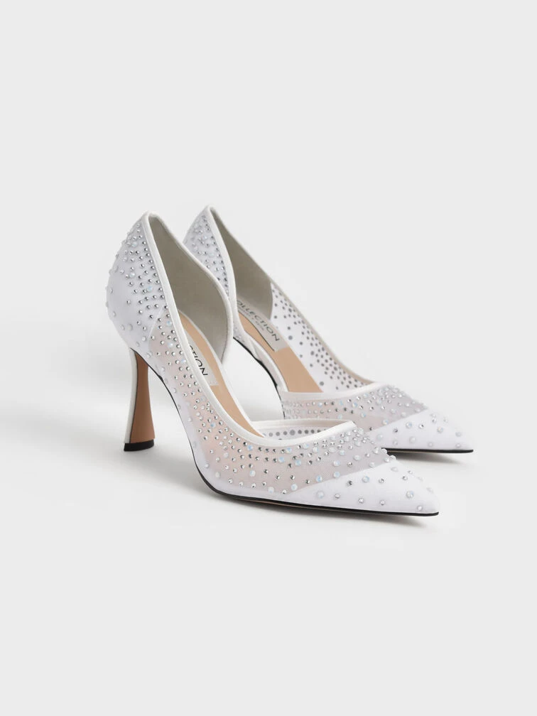 Add a modern fairy-tale mood to your bridal look with our Blythe mesh pumps. Featuring a subtle half d’Orsay silhouette, these delicate white shoes are an elegant choice for the modern bride. Topped with metallic and irridescent embellishments, it will dazzle onlookers when the light hits at the right angle. Imagine it with a silk gown featuring mesh detailing at the neckline — truly a perfect match for an unforgettable event.