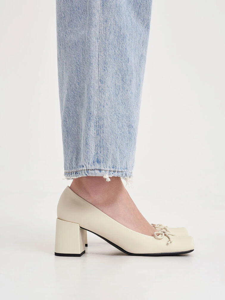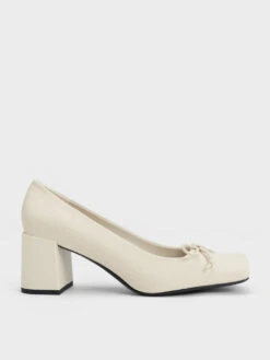 With a trendy square-toe design and bow embellishments, these elegant pumps guarantee serious lift in terms of style and elevation. Set on sturdy block heels, they are comfortable enough to wear for hours on end. The versatile chalk colour also works well with a range of outfits. Show these beauties off with short hemlines.