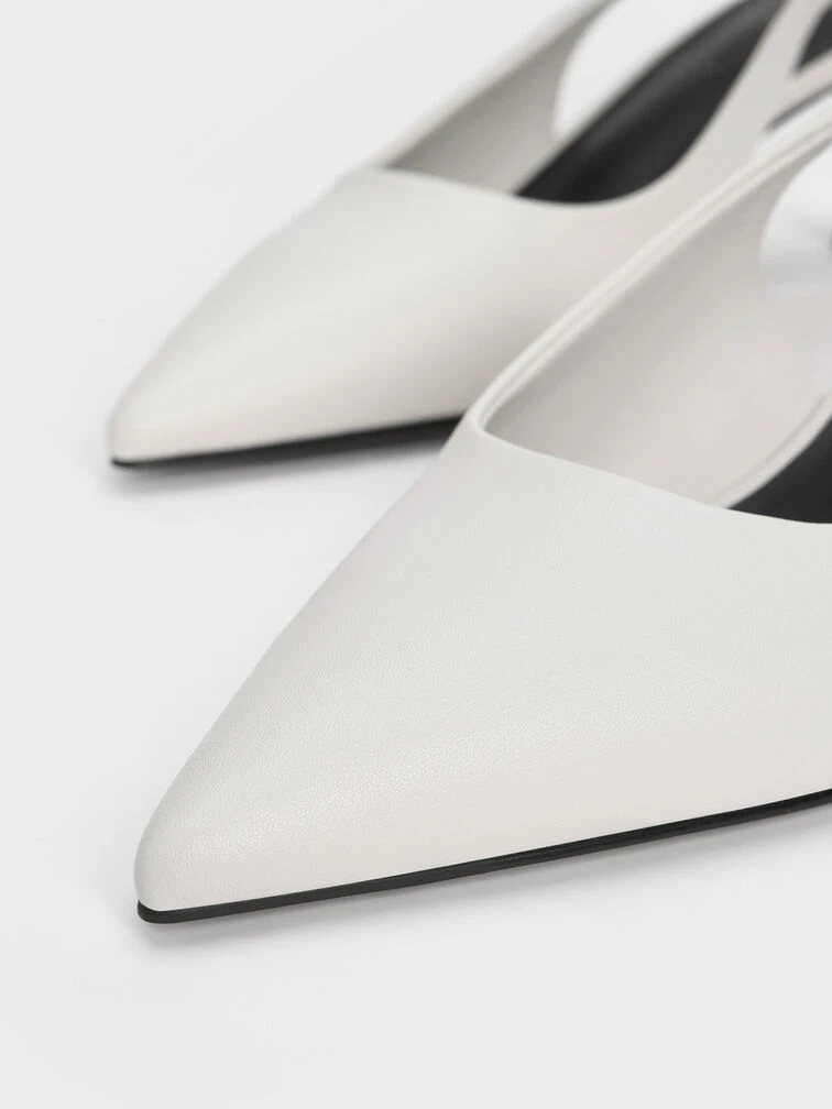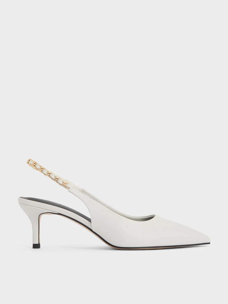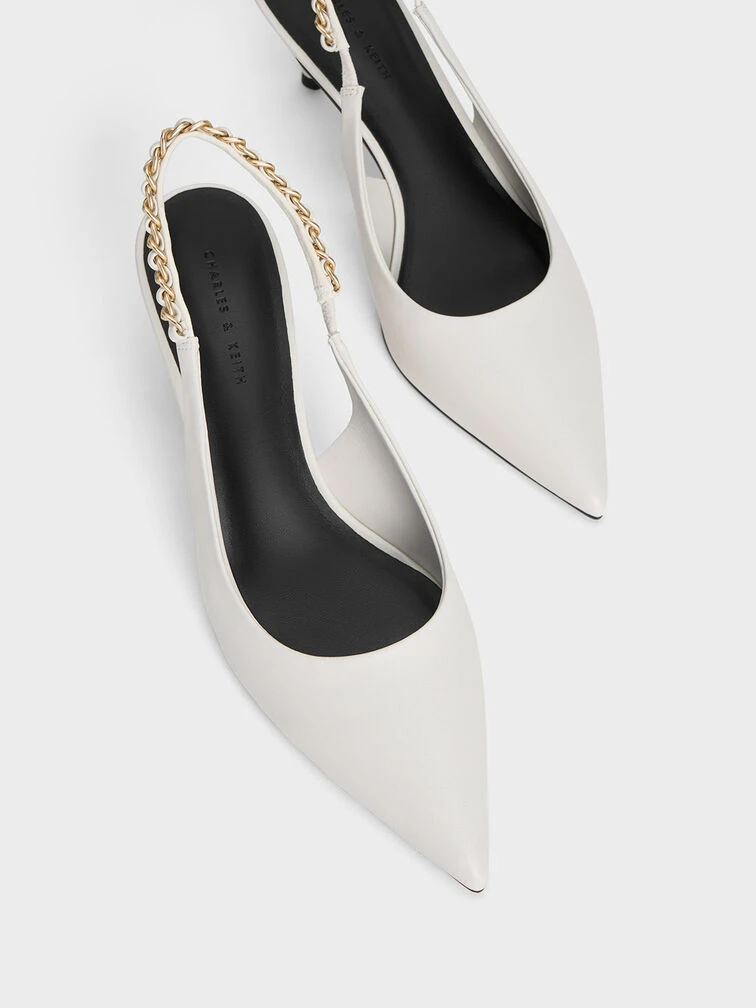 You can never go wrong with a neutral-toned pair of pumps, like this pair. Timelessly elegant pointed toes meet a versatile white finish for a minimal yet impactful silhouette. To add subtle visual interest, braided gold-toned chains lend an air of sophistication to these classic slingback straps. Set on stiletto heels, these pumps will boost your stature for that ultra-chic look, no matter the occasion.