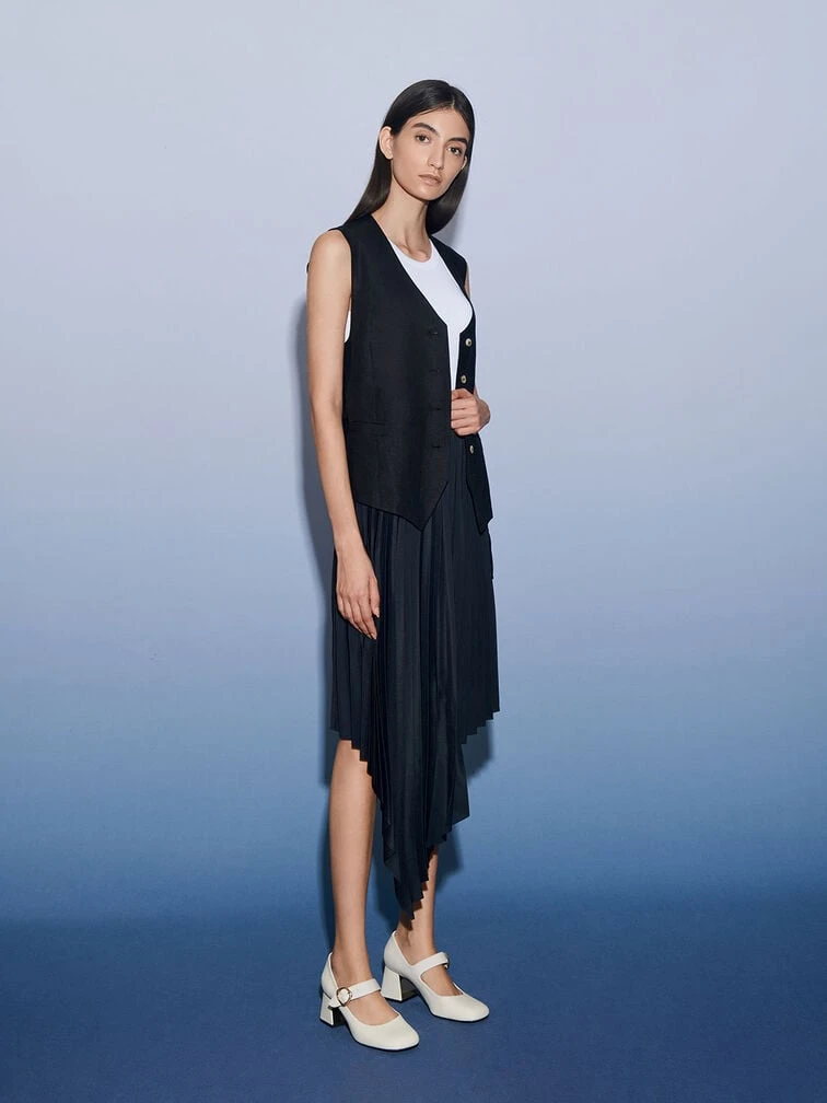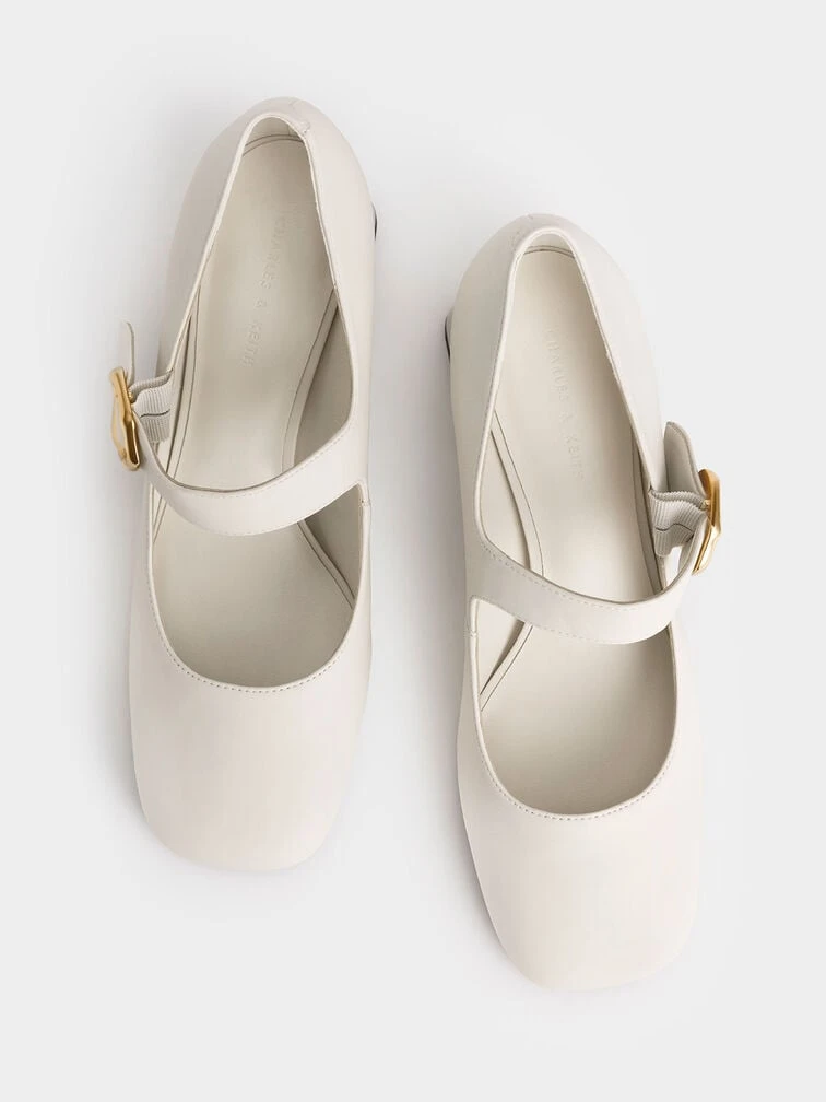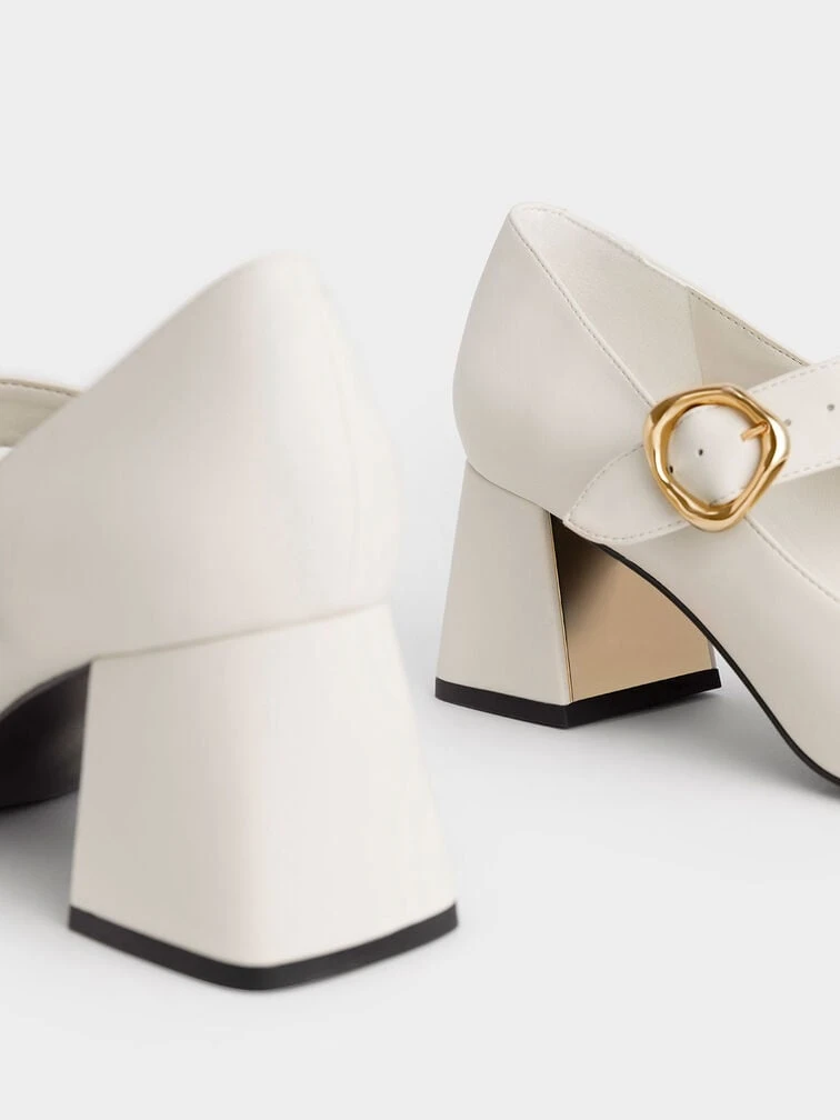 A sensible pair of pumps that a fashion girl can count on during the busy work week. Between the rounded square-toe feature and the gold-tone hammered buckle, there is no shortage of modern design elements that will help you stand out from the crowd. Set on sensible 6cm trapeze block heels, these leg-lengthening Mary Janes were made for round-the-clock comfort. Bonus points for the versatile chalk finish.