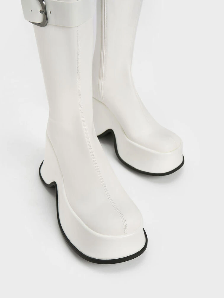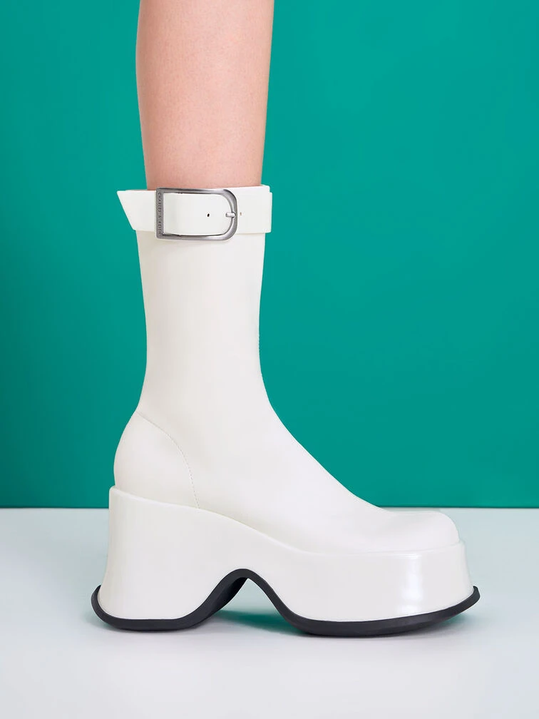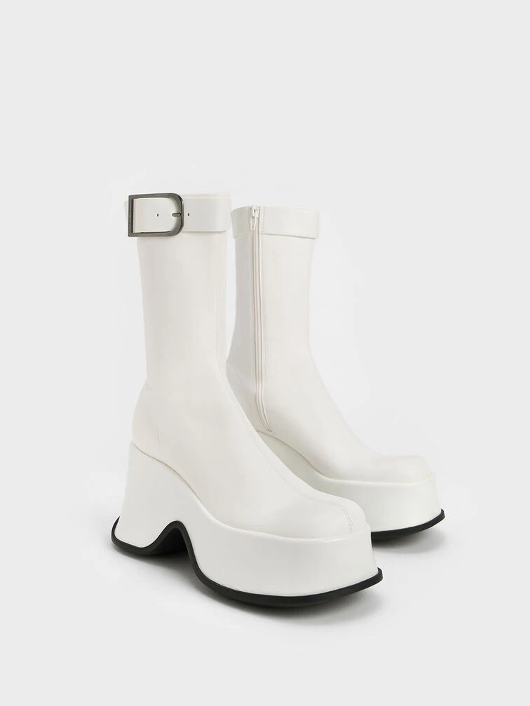 In a crisp white colourway and featuring an architectural silhouette, these Carlisle boots are visually impactful. Set on sleek sculptural platform soles, they will add height to your stature without compromising your comfort. Plus, they come with adjustable buckled straps at the top of the collars to create the perfect fit. Let this palette-cleansing design ground your favourite floral dresses.