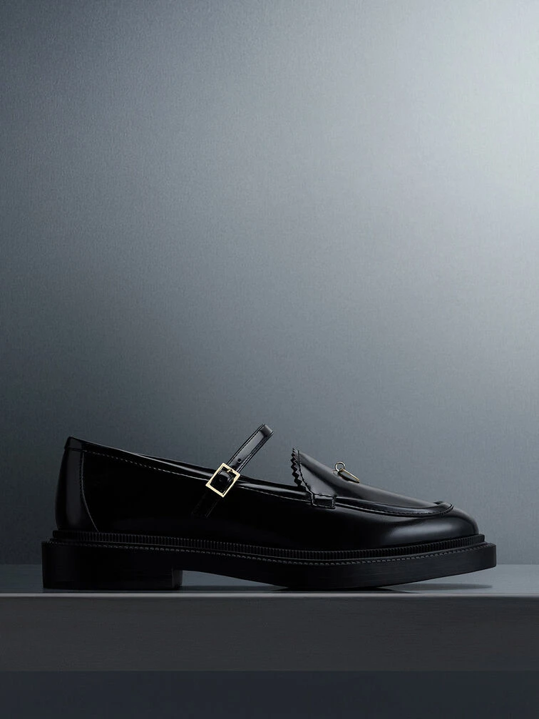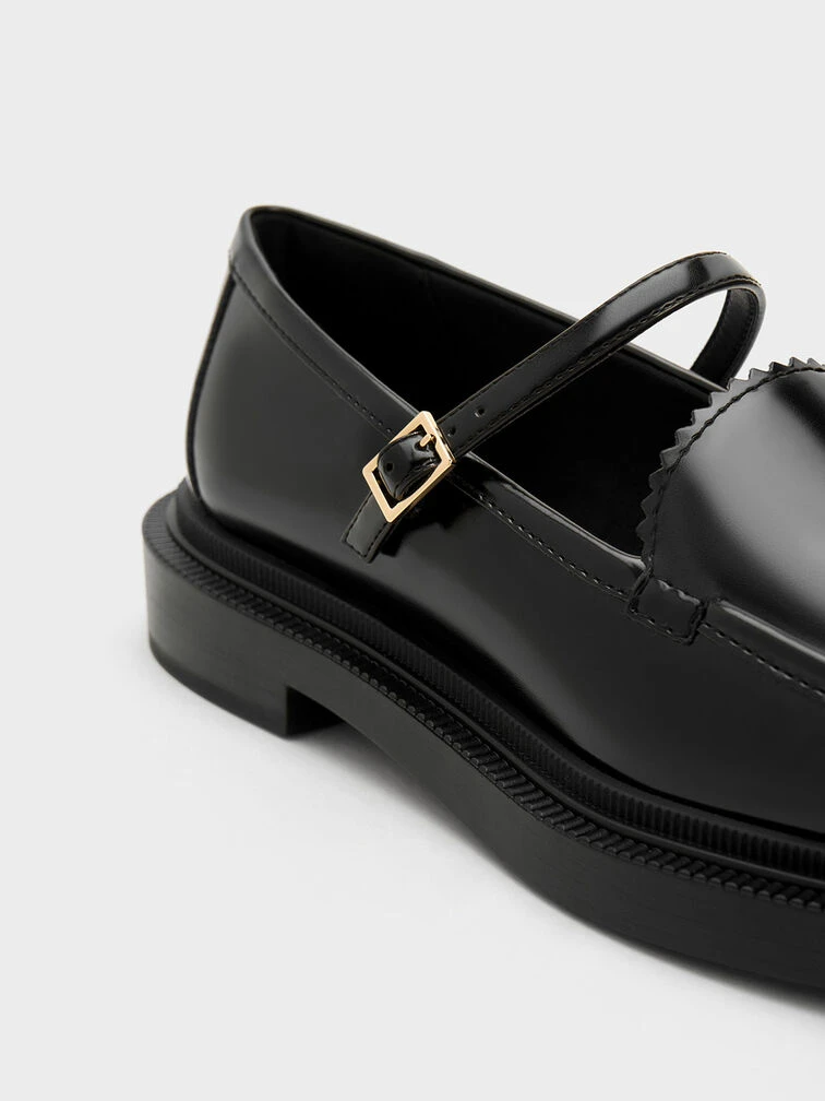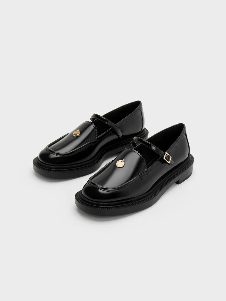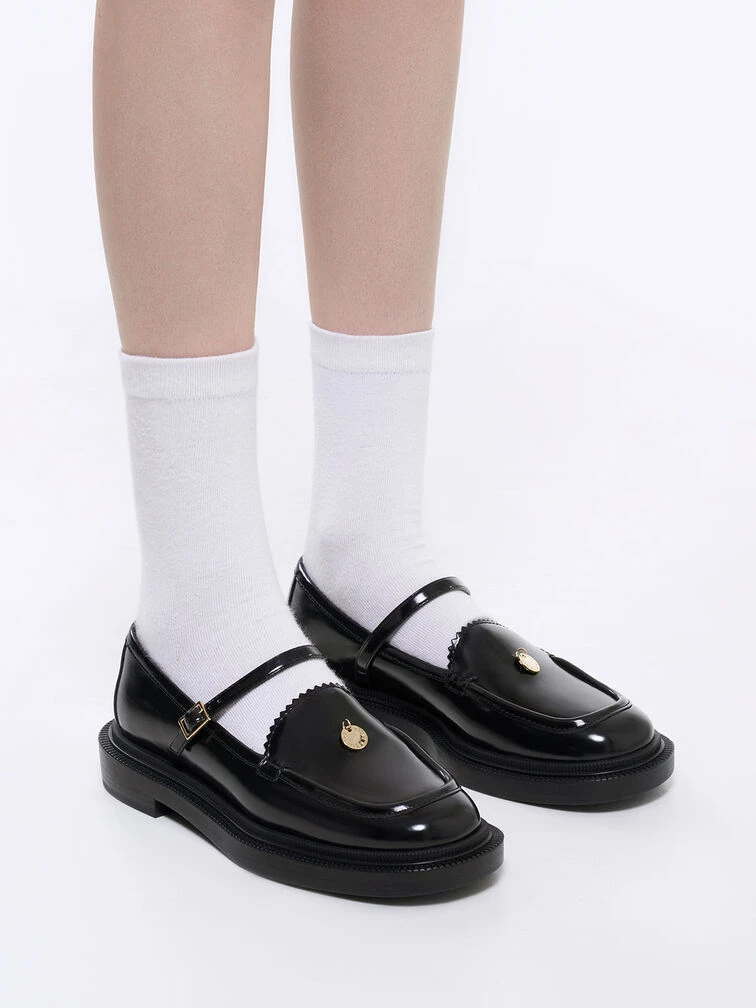 Lean into the preppy aesthetic with these Mary Janes. The glossy, all-black finish gives these shoes a subtle sheen that will elevate a simple outfit and make it stand out. Featuring jagged detailing on the toplines and dainty silver-toned charms on the vamps, they will make for a unique addition to any shoe collection. Set on low 3cm block heels, they offer a modest lift without compromising comfort.