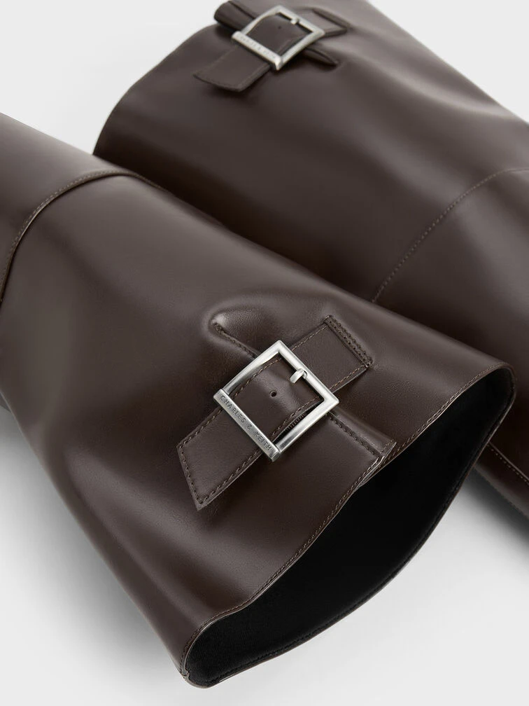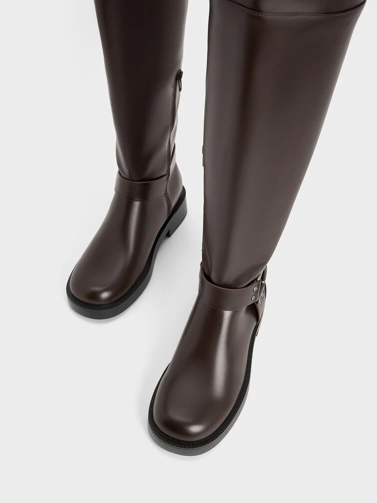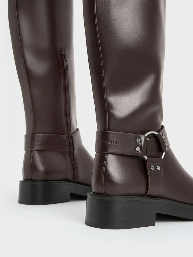 Featuring a utilitarian style reminiscent of biker boots, these boots will effortlessly elevate your go-to winter outfits. Silver-toned harness details are a distinctively edgy feature that stand out against the rustic dark-brown finish. To create a charming slouchy silhouette, their wider top edges can be adjusted to your desired snugness with the belted side buckles. Not only will these boots keep you warm, but they will also add a fashion-forward touch to your cold-weather looks this season.