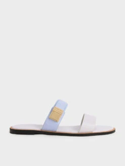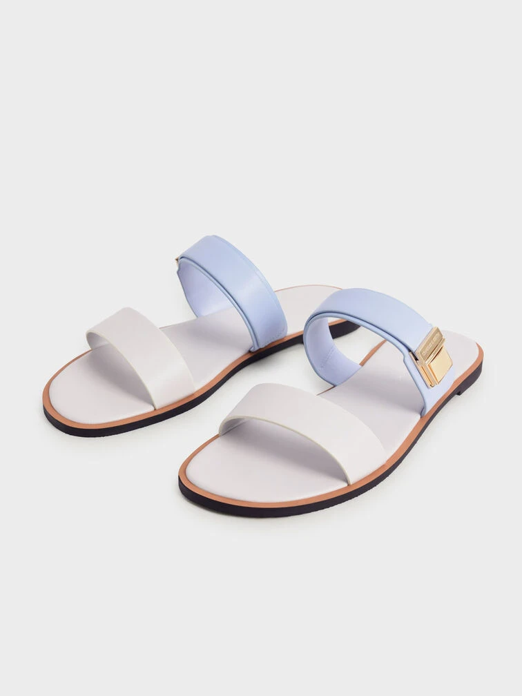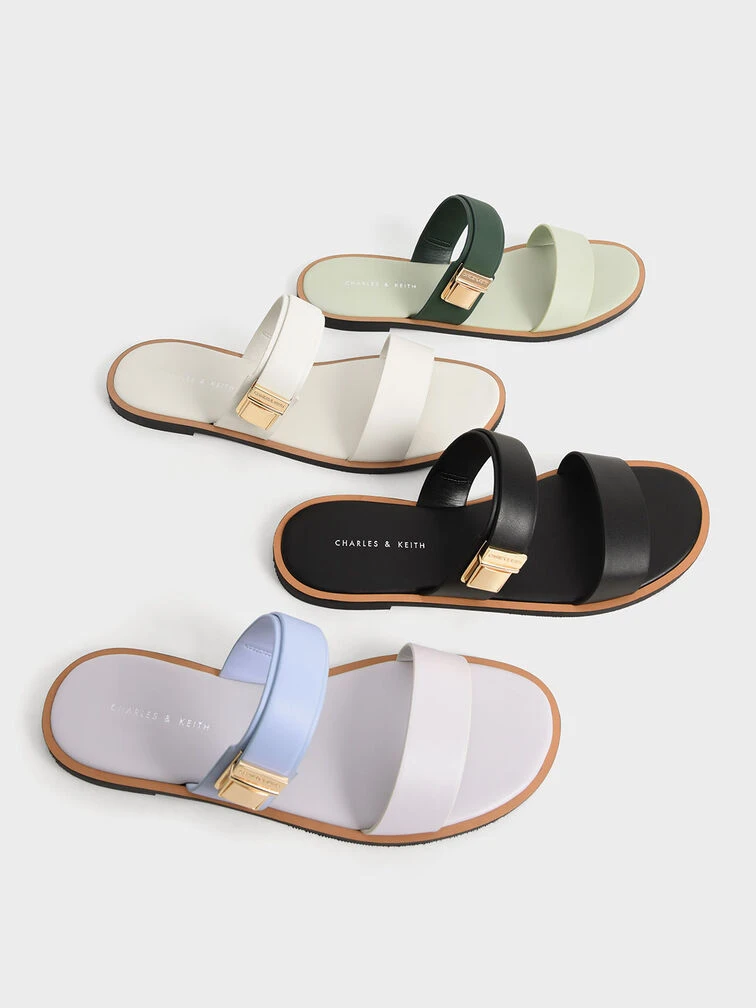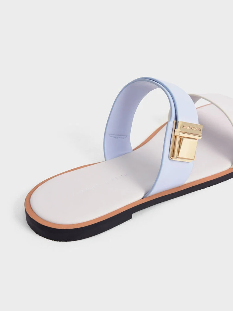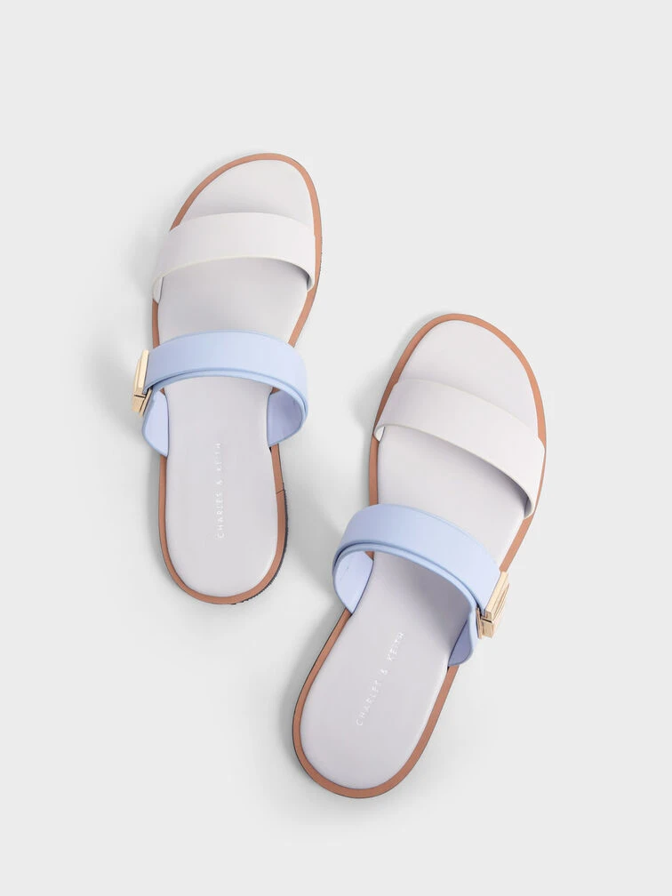 Optimise your spring wardrobe with these extremely versatile slide sandals, and get ready to put your most fashionable foot forward. Exuding elegance and grace, these light-blue beauties feature a smooth round toe that gives them a feminine touch, while the gilded metallic buckle adds extra oomph to all your looks. For a fresh take on ladylike style, pair them with a wrap dress and a pair of round sunglasses.