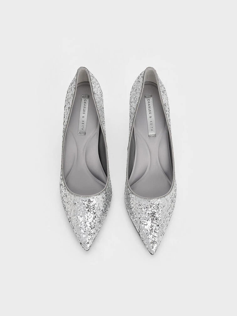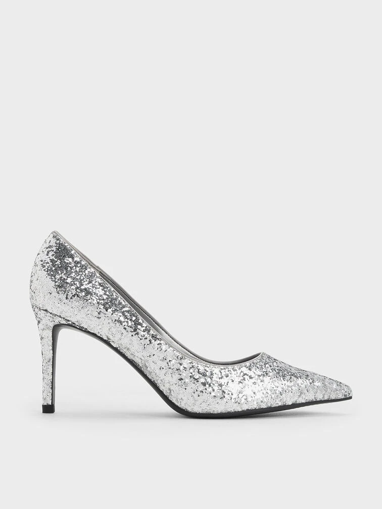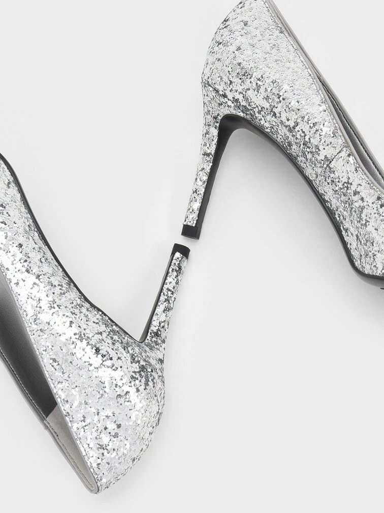 This iteration of the Emmy glittered pumps have all the makings of the quintessential festive season shoe. The shimmery silver finish is eye-catching and distinctive, while still being a versatile shade that will complement many looks. Applied to a timeless pointed-toed silhouette, these pumps exude an effortless elegance that will elevate even the simplest outfit. Fitted with 8cm stiletto heels, they have a flattering leg-lengthening effect.