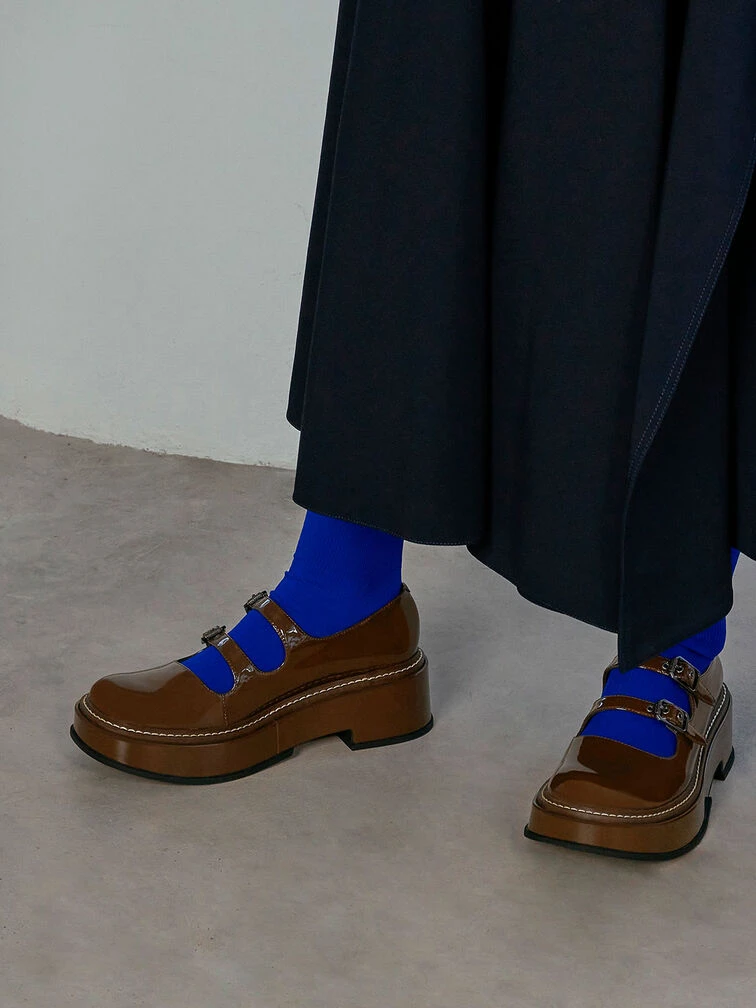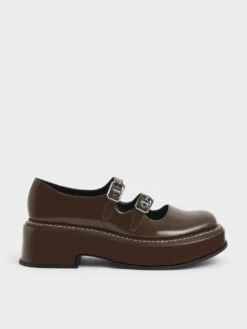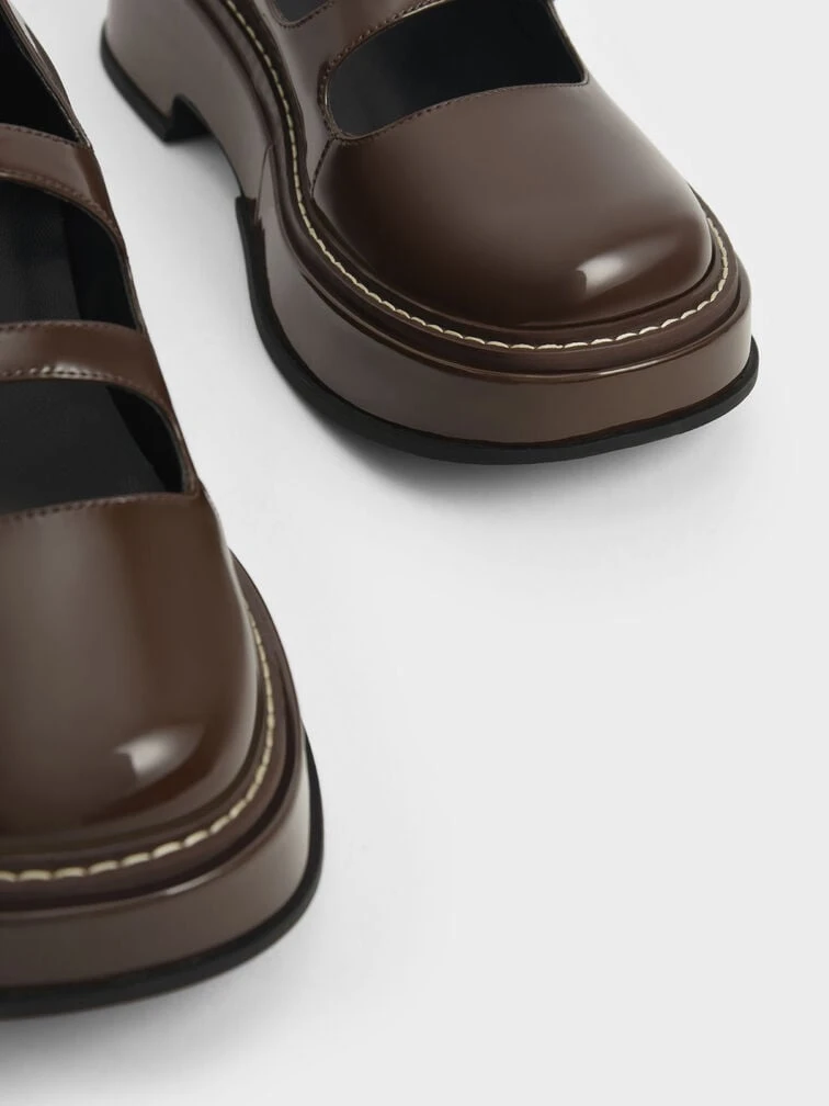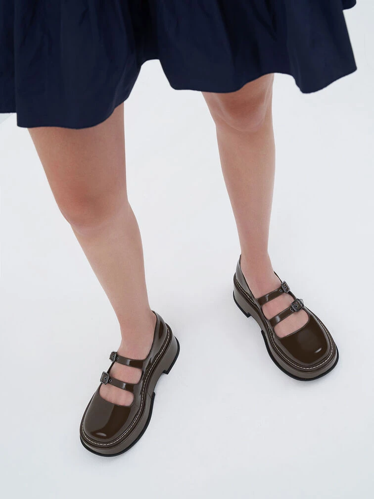 Stay ahead of the times with our Frankie platform Mary Janes. The epitome of pure elegance, this contemporary pair comes topped with an interesting contrast stitch detailing and double buckle straps that will add a vintage vibe to any look. Finished in an intense glossy oak-brown hue, these patent platform Mary Janes will work wonders with an organza dress and half-moon crossbody bag.