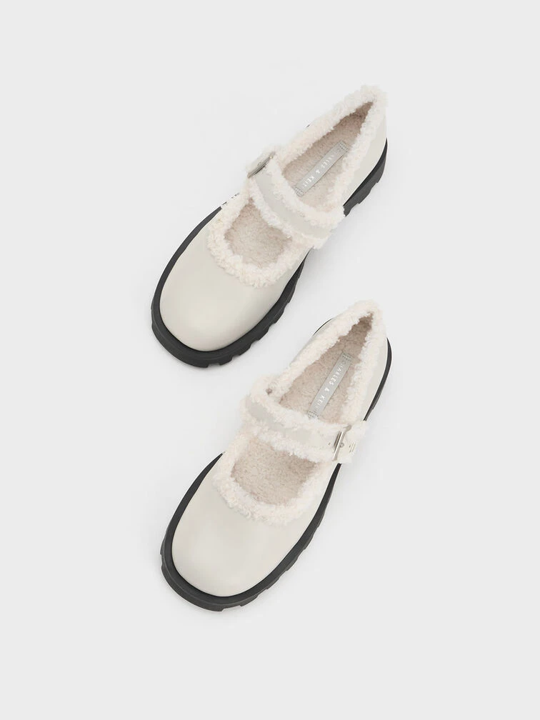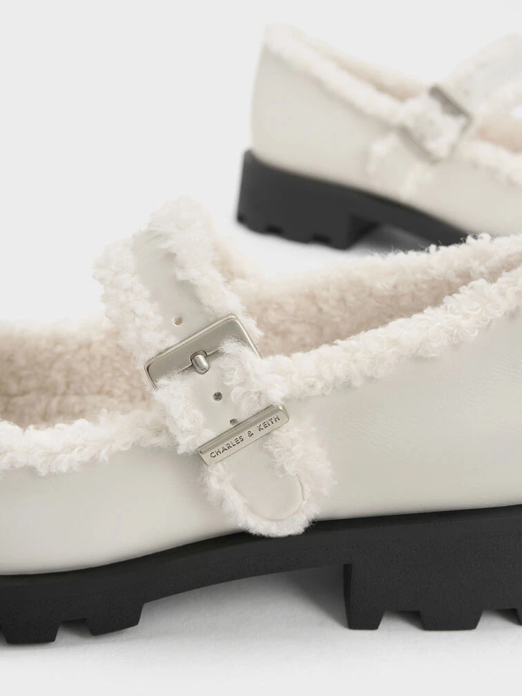Take your Mary Janes into the colder seasons with this fur-trim iteration. Fur-trim lines the insides of the shoes and the buckled straps, complementing the soft chalk finish for a cosy look. Hardware on the buckled straps adds a slightly edgy textural contrast while offering a customisable fit. To channel the coquette look and stay warm at the same time, pair these with frilly socks.