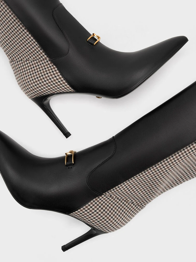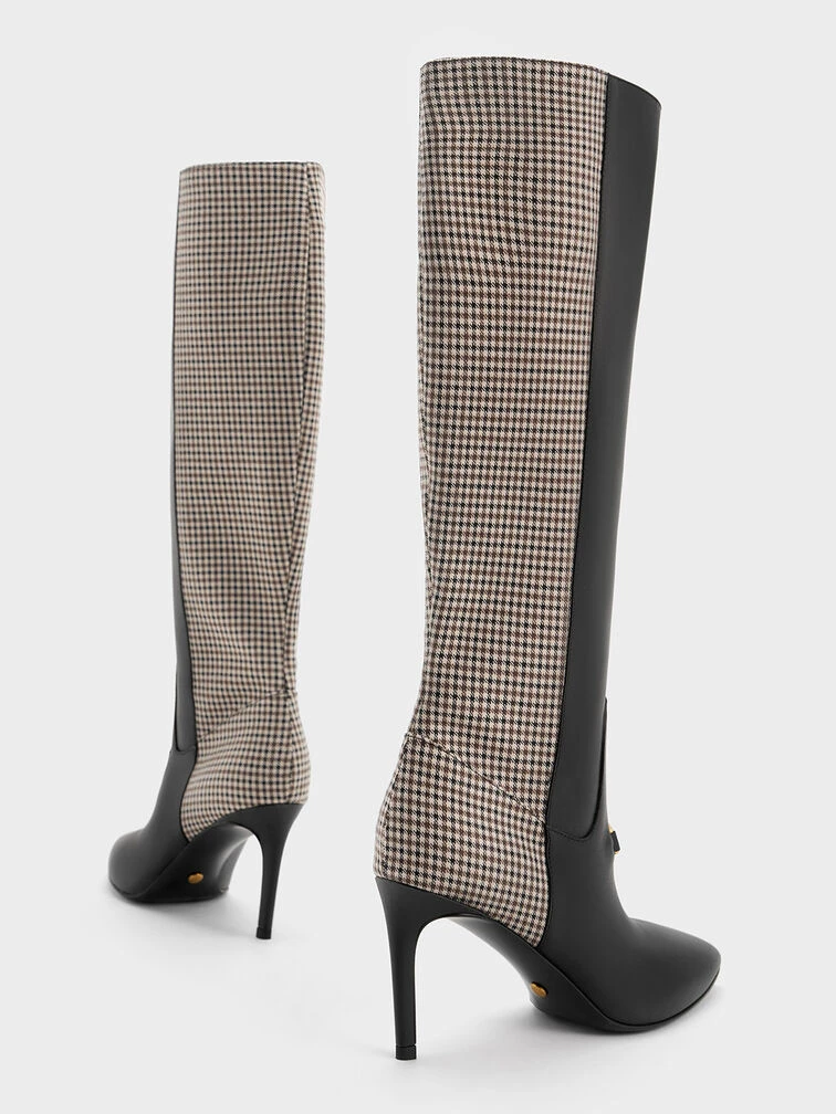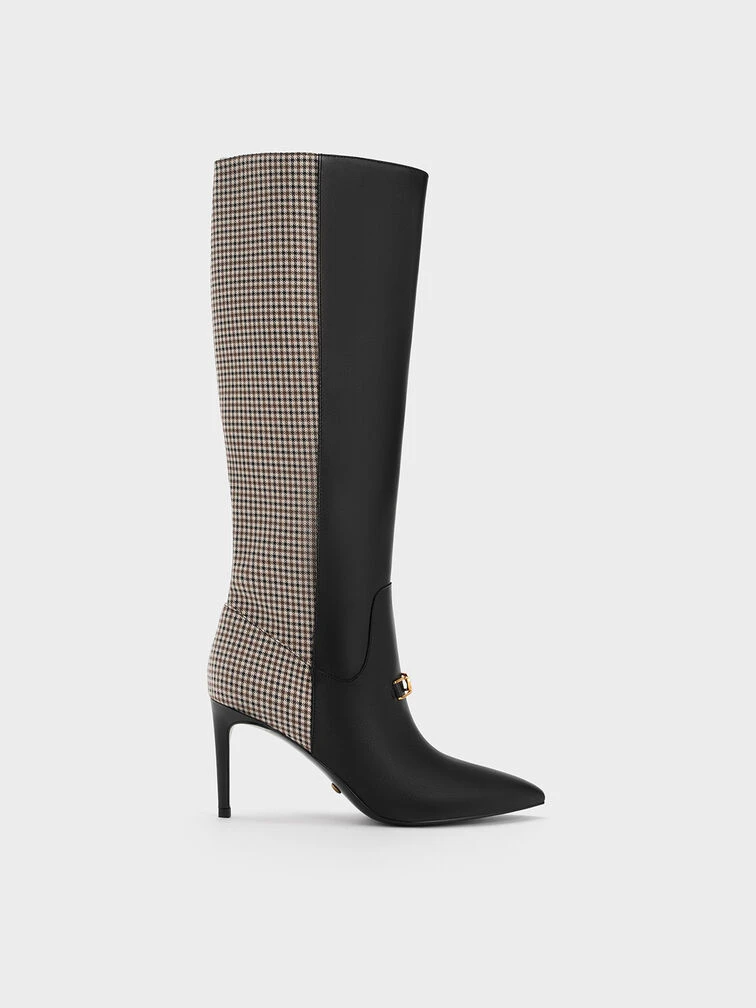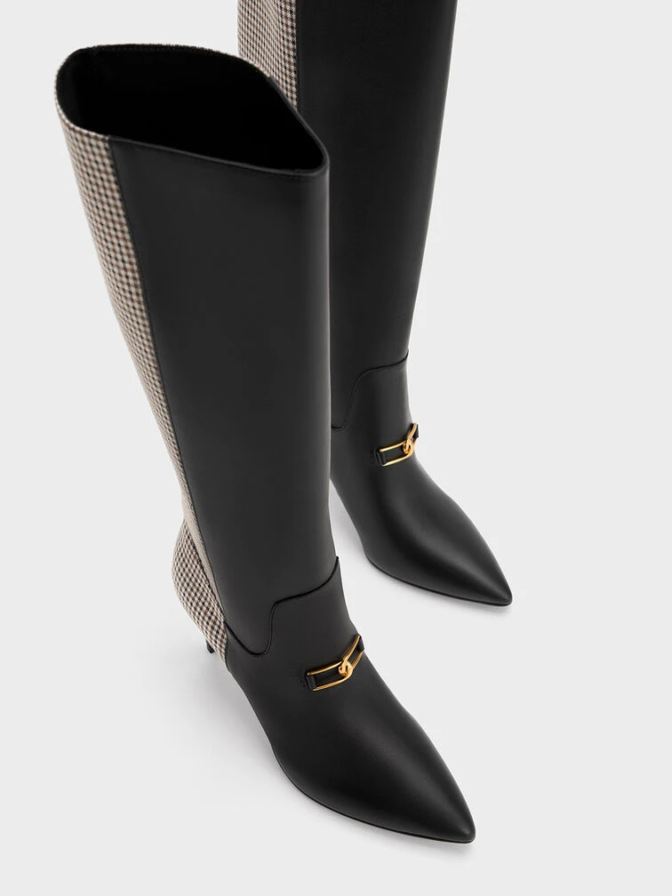 Add a cosy touch to your winter wardrobe with this checkered iteration of our Gabine heeled knee-high boots. Featuring a unique two-toned checkered jacquard and black leather finish, these shoes also come with interlocking U-shaped buckles distinct to the coveted Gabine range for stylish flair. Juxtaposing a wide-fit knee-high silhouette against skinny stiletto heels, these boots have an undeniably stylish slouchy structure. Bonus points for the genuine leather construction, which gives these boots a luxurious look and feel.