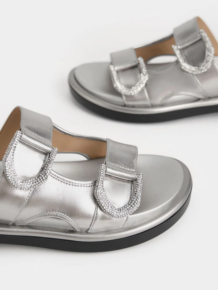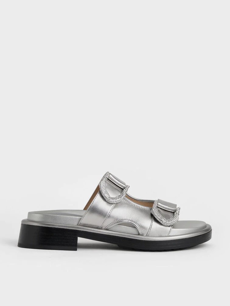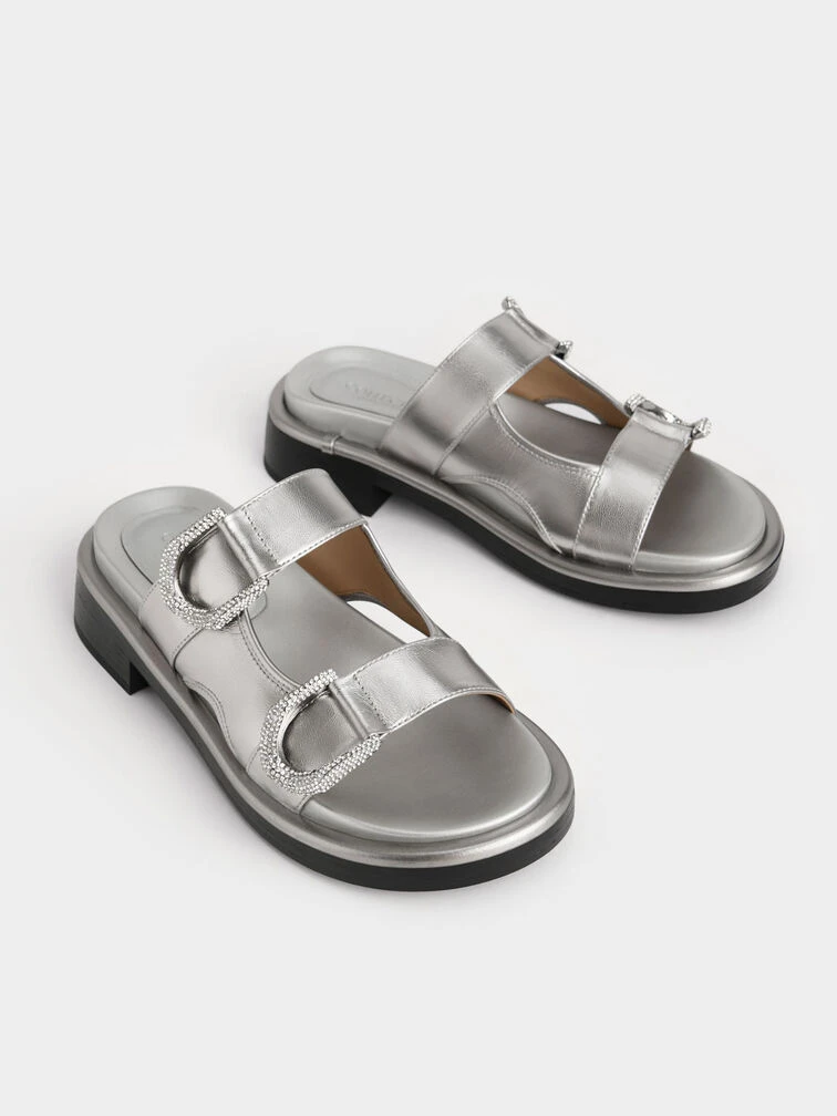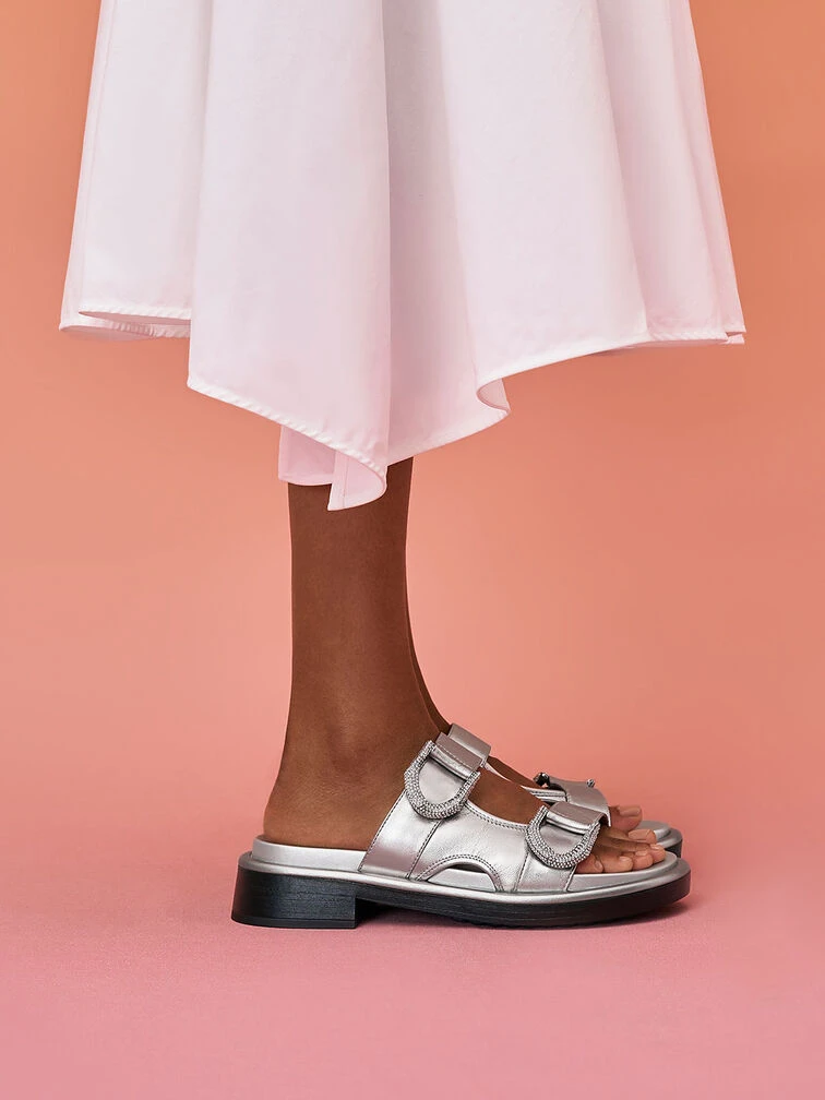 The versatility of our iconic Gabine buckle knows no bounds. Studded with jewels for extra shine, it adds more oomph to strappy slide sandals that feature a striking pewter finish. They sit on low block heels that offer a boost in style and stature without sacrificing comfort. Pair them with a metallic mini dress for a bold festive look that will steal the spotlight at any party.