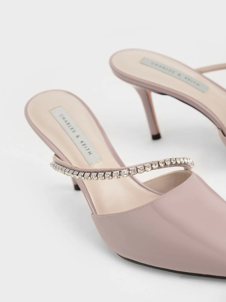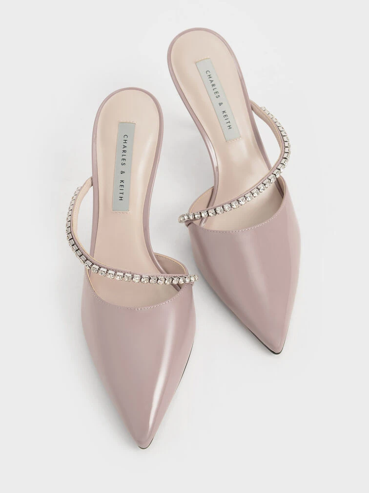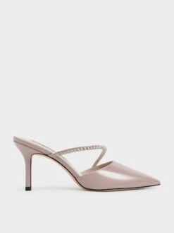 Amp up your style quotient in an instant by slipping on a pair of our gem-encrusted patent mules. From the sweet taupe finish to the asymmetrical gem-embellished strap across the vamp, these shoes are pretty and polished, offering the perfect amount of shine. Thanks to the striking 8cm heels, these shoes will elevate your stature and help you stand out from the crowd.