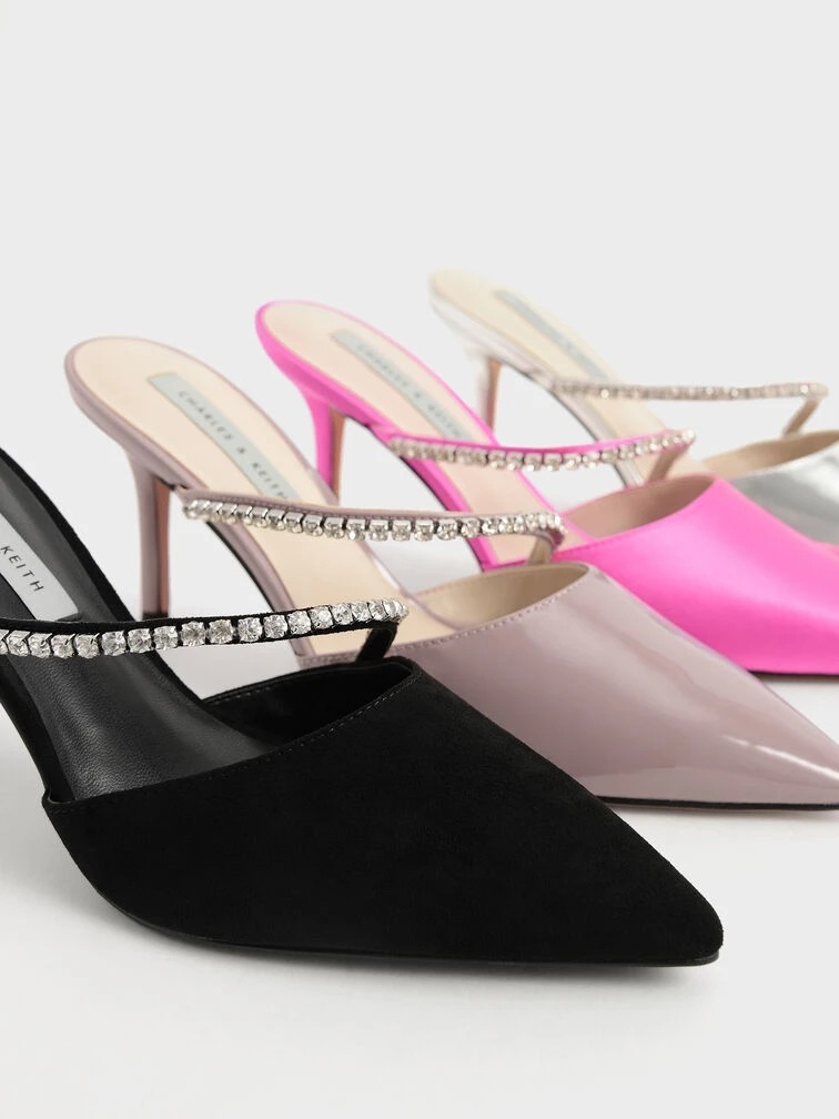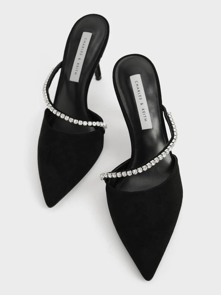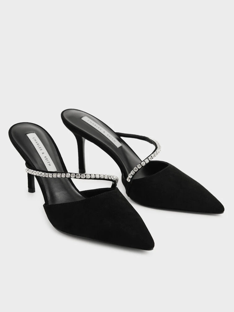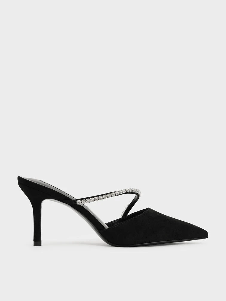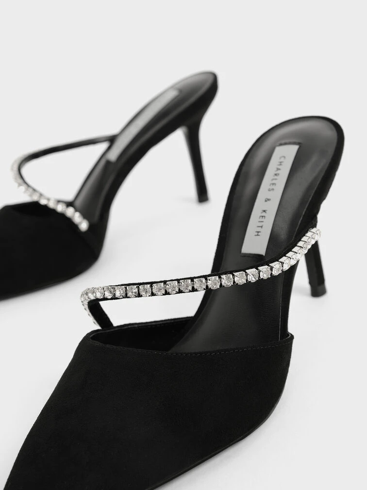 Dare to stand out from the crowd in these trendy heeled mules. The sleek black colour and trendy asymmetric embellished strap will leave a lasting impression, while the textured faux suede finish and fierce covered pointed toe will elevate your outfits in no time. Looking effortlessly chic is easy when you slip on this pair with a tube top, leather pants and a belt bag.