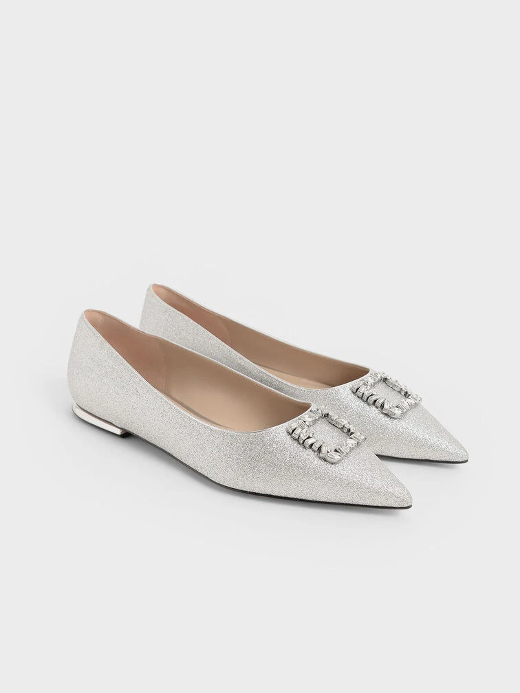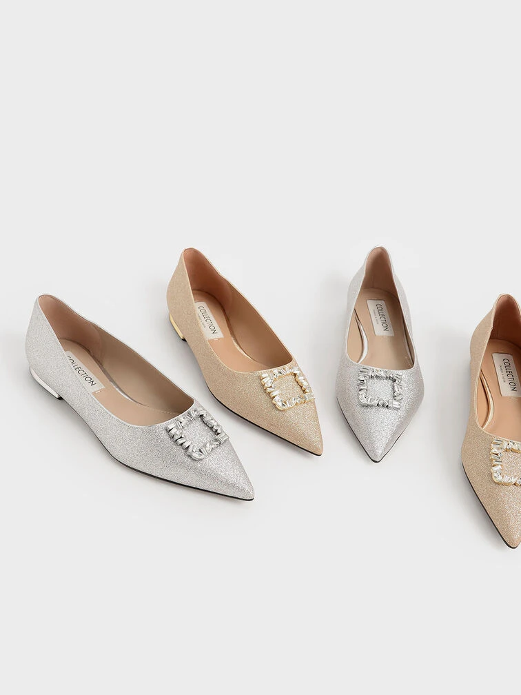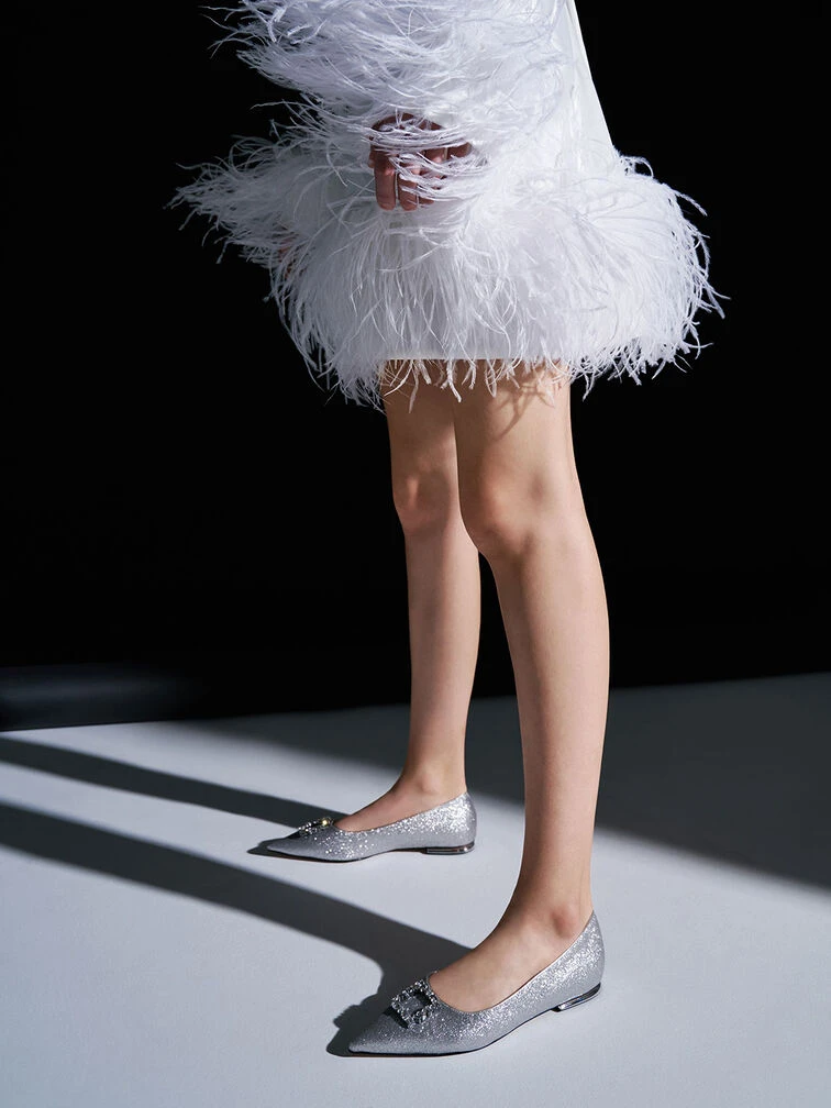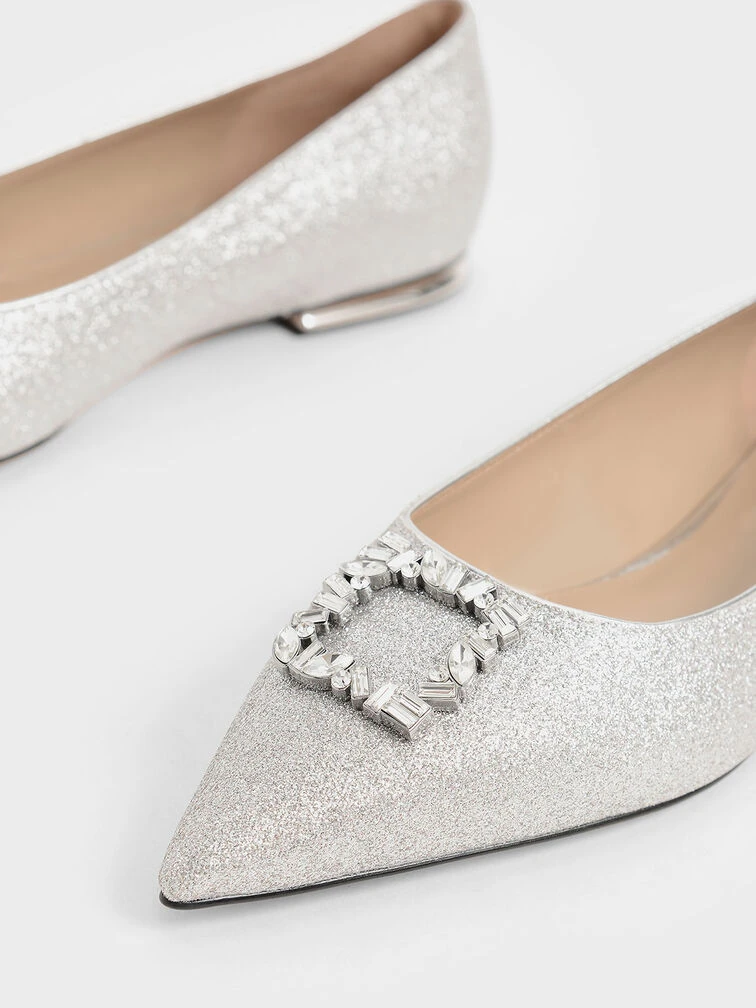 Looking for the perfect bridesmaid shoes? You have found them. Dusted with silver glitter, embellished with gems, and set on a low 1.2cm heel, these beauties are both easy on the eyes and your feet — exactly what you need as a busy bridesmaid who does not want to compromise on style. Great for dresses of all lengths, these ballerina flats will also do justice to a jumpsuit and chain-strap crossbody ensemble.