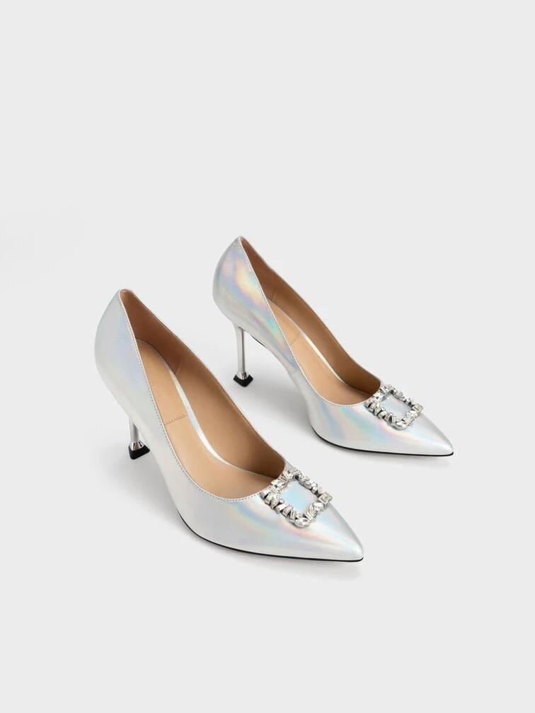 Expect all eyes to be on you when you step out in these stunning pumps. While their holographic finish makes a big fashion statement, the sleek pointed-toe design keeps things classy and elegant. These pumps’ impressive 9cm fluted heels and sparkly gem-embellishments will take your outfits to new sartorial heights. Style them with a sequinned bodycon dress for a dazzling more-is-more look.