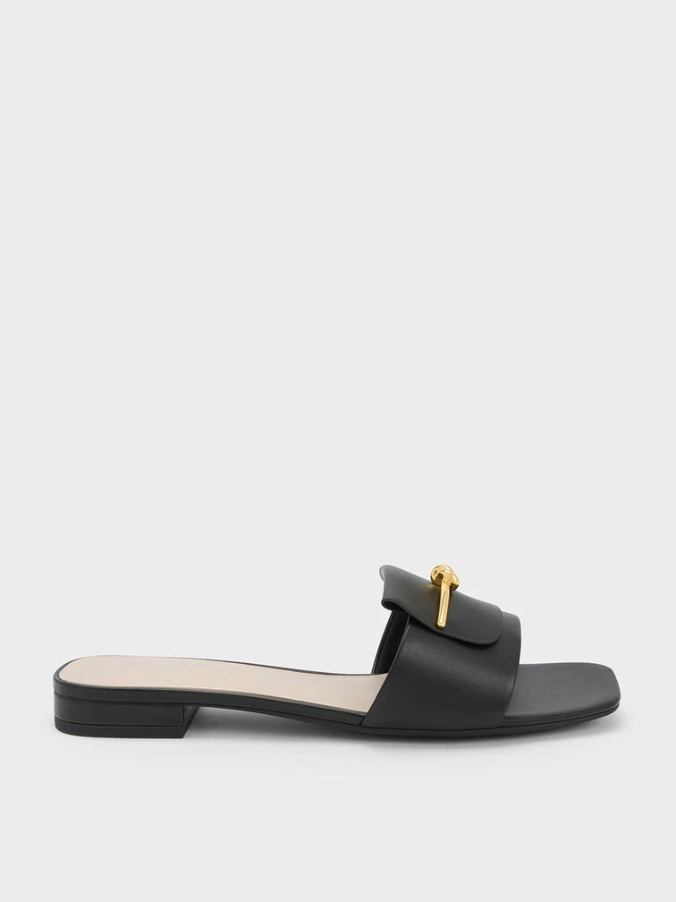 Versatile and sophisticated, these slide sandals make a strong case for the slip-and-go style. In a match-all chalk colourway, they will fit seamlessly into your existing wardrobe. Adorned with gold-toned hardware, including the sleek knotted metallic accents on the tabs, they are a worthy addition to any fashion arsenal.