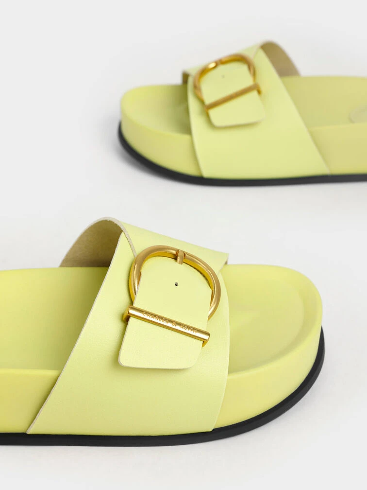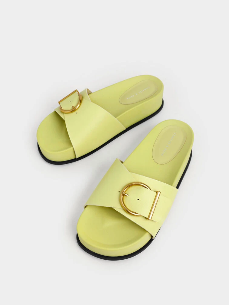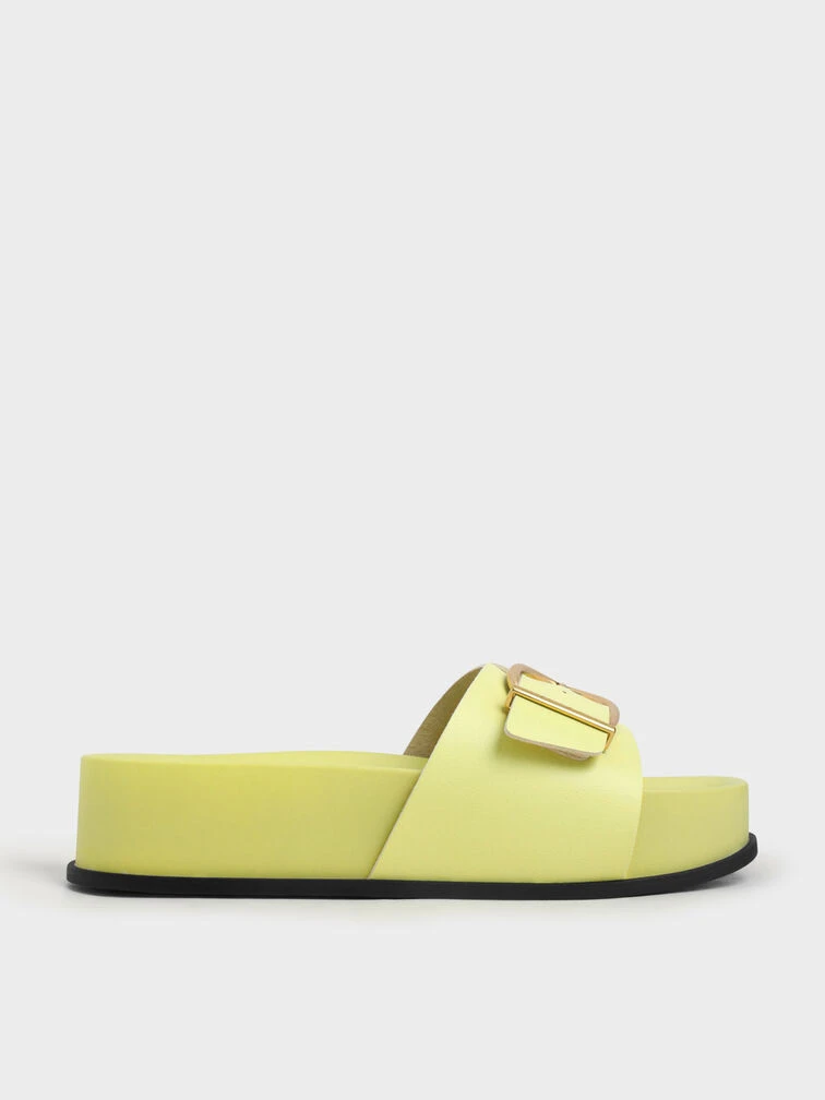 Our metallic buckle flatform sandals are perfect for those looking to diversify their wardrobe’s colour-palette. In light yellow, this refreshing design will complement and put an eye-catching touch into your everyday ensembles. Featuring a 4.5cm padded sole, they offer flattering elevation while ensuring comfort. Match these sandals with denim shorts and a graphic t-shirt when you head out on your next beach day. Complete the look with cool aviator sunglasses.