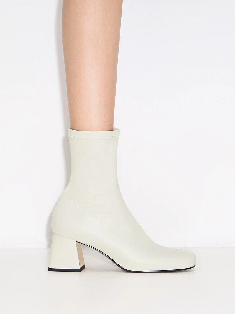 This pair of sophisticated ankle boots have all the features we love about the classic fall shoe style – covered round toes, subtle stitch-trim details, and a side-zip design that makes them easy to put on and take off. Complete in an elegant, all-white hue and metallic gold trapeze block heels, the small but striking details imbue them with a subtly luxurious flair that will put the perfect finishing touch on any ensemble.