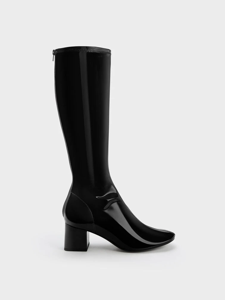 Turn heads wherever you go with these bold and outstanding knee-high boots. The luxurious patent finish will exude a glamorous shine that is impossible to miss, while the understated stitch trims add a touch of understated elegance to the design. The 5.5cm block heels offer a boost in height without compromising comfort. Plus points for the back zips that make putting them on a breeze.