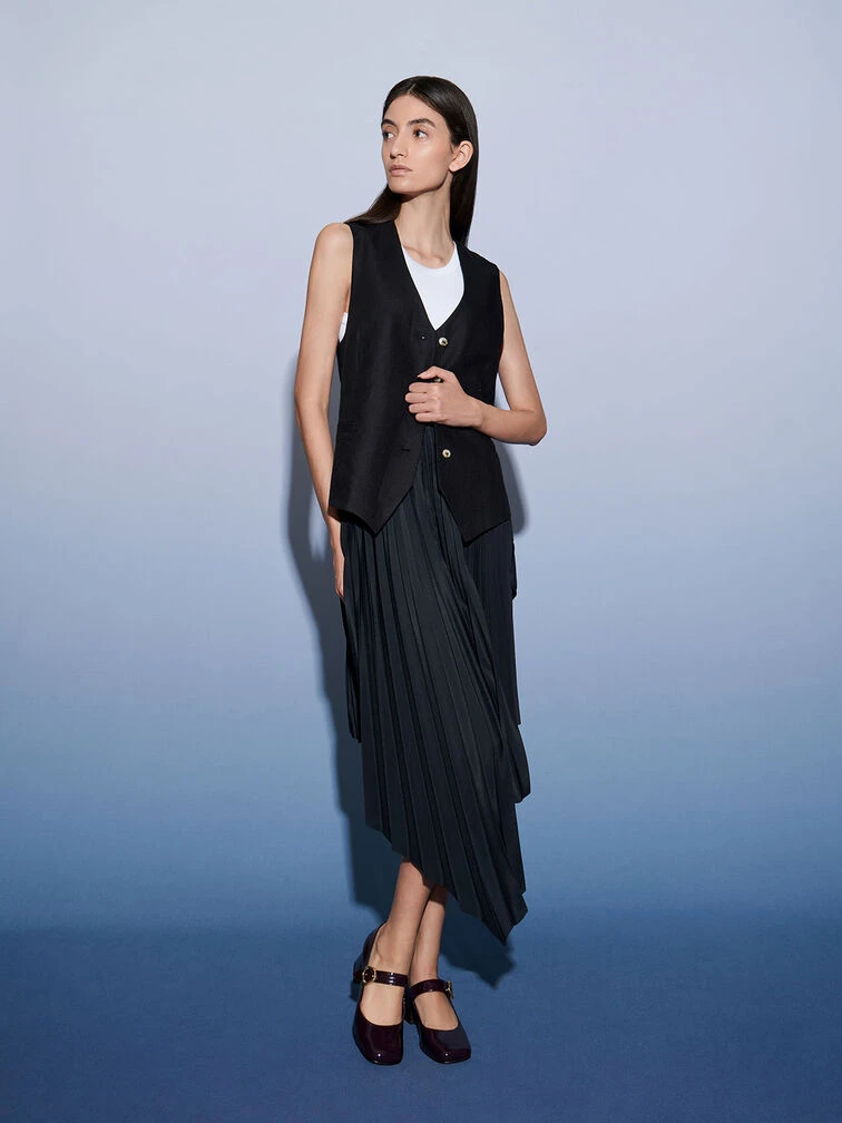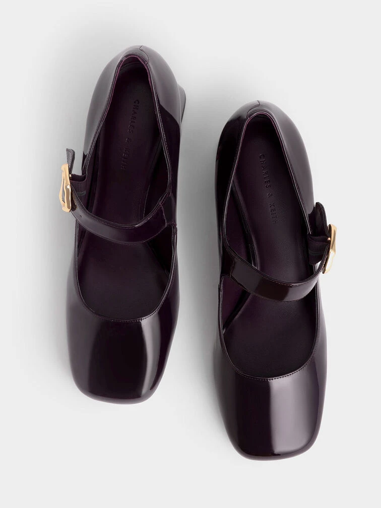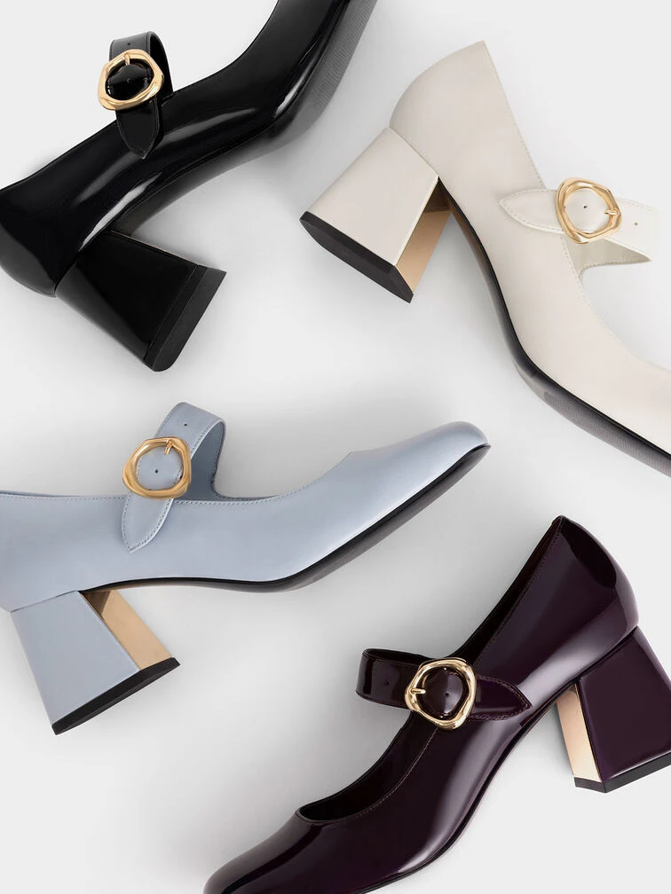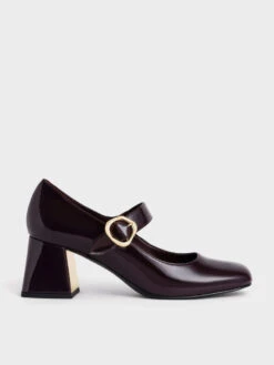 Maroon pumps so dark that they can pass off as black — perfect for those who wish to add just a hint of colour to their everyday ensembles. This pair features a classic Mary Jane design that is elevated by way of the modern rounded square-toe and gold-tone hammered buckle. Set on trapeze block heels that are equal parts chic and comfortable, they tick all the right boxes as a desk-to-dinner outfit companion.