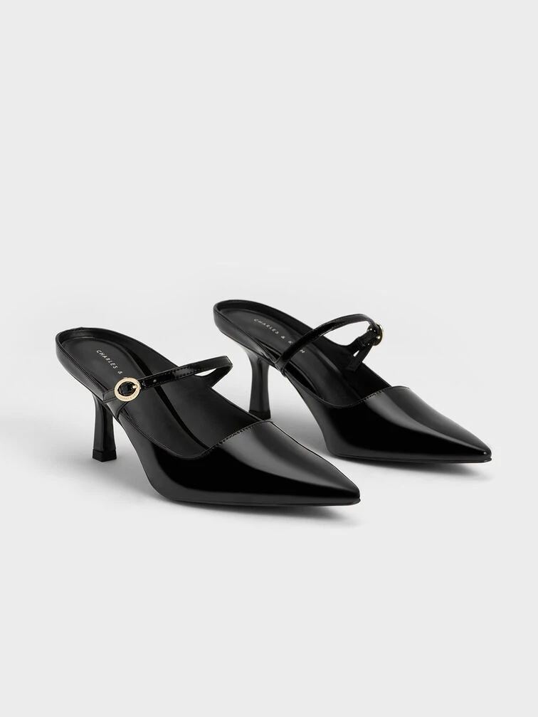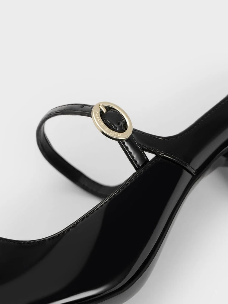 Bring a little more shine and style than usual with these glossy Mary Janes. They feature a square topline and a sharp pointed toe that offers a leg-lengthening effect. In a sleek black colourway, they will match anything you pair them with. Plus points for the 7cm stiletto heels that offer an extra lift.