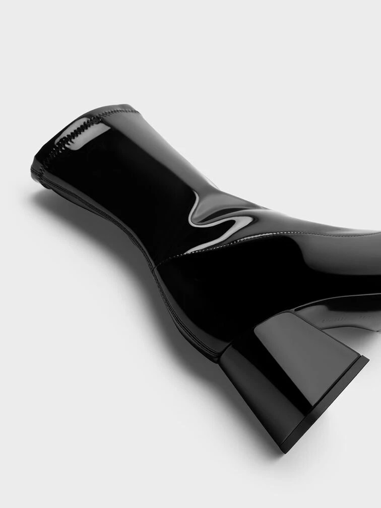 This pair of sophisticated ankle boots have all the features we love about the classic fall shoe style – covered round toes, subtle stitch-trim details, and a side-zip design that makes them easy to put on and take off. Made with a glossy all-black patent finish and metallic gold trapeze block heels, these shoes’ small but striking details imbue them with a subtly luxurious flair – they will put a stylish finishing touch on any ensemble.