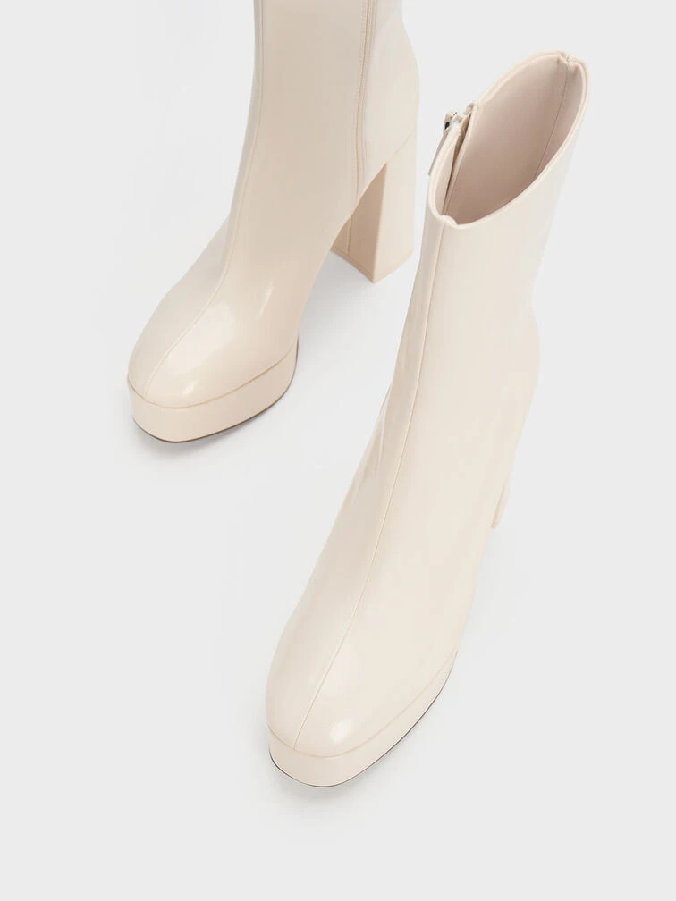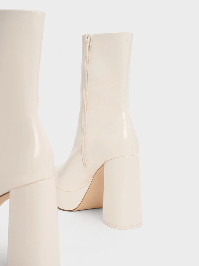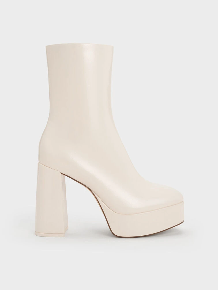 Looking for a pair of shoes to kick off the fall season in style? Start here with these fresh, off-white ankle boots. Featuring a sleek pointed-toed silhouette and a rich maroon finish, you can count on these boots to complement any cool-weather look without fail. Set on 11cm platform heels, they have a flattering leg-lengthening effect that will put a confident bounce in your step.
