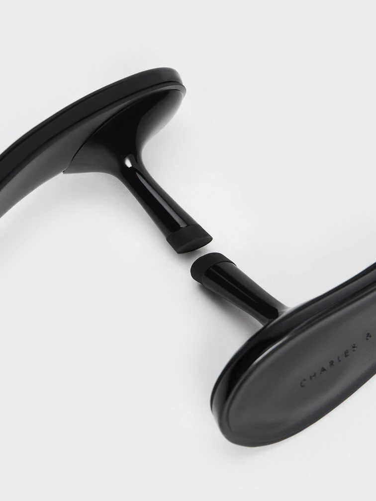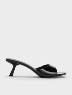 Sleek and versatile, these mules offer incredible style mileage. The minimal design is rendered in a glossy black finish for a sophisticated aesthetic that feels classic yet refreshing. Elevating the casual slip-on style, sculptural slant heels boost height and inject subtle visual interest. Pair these mules with your daily ensembles for a relaxed-chic off-duty look.