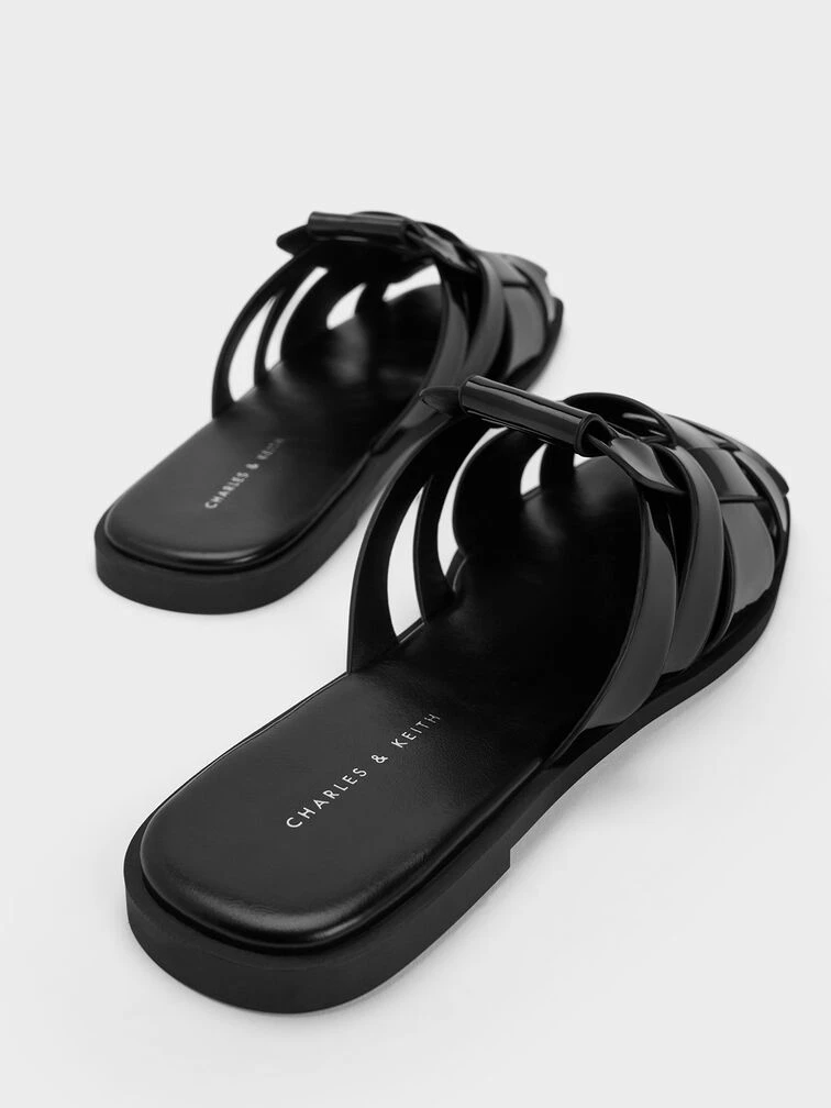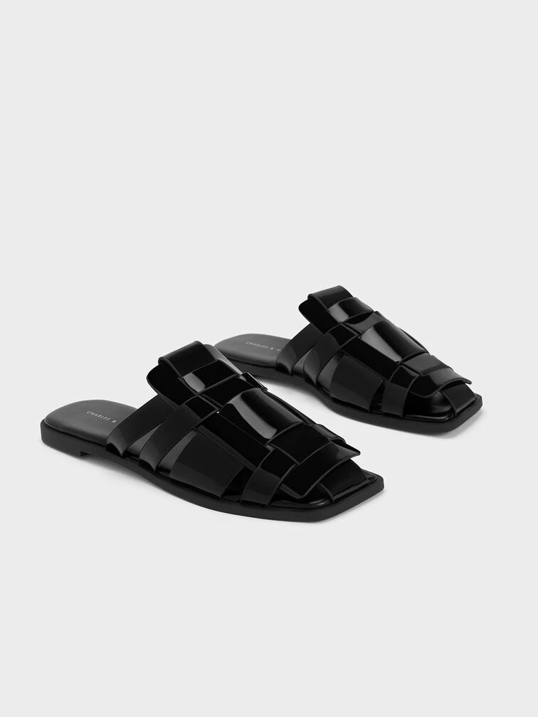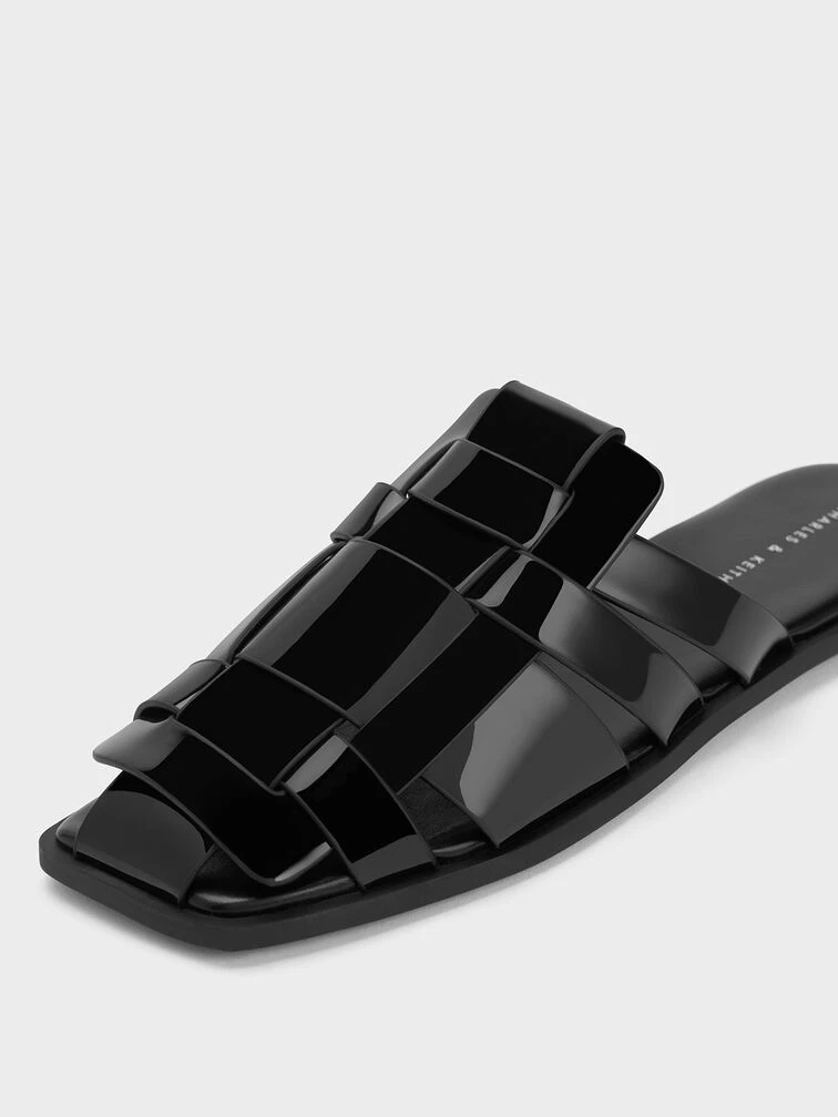 Effortlessly sophisticated, this pair of flat mules proves that black is anything but boring. With a glossy patent finish juxtaposed against a visually striking weave pattern, these mules will captivate attention no matter where you go. Let these shoes take you from leisurely window-shopping days to romantic seaside strolls and delightful alfresco dinners, all while maintaining an impeccable sense of ease.
