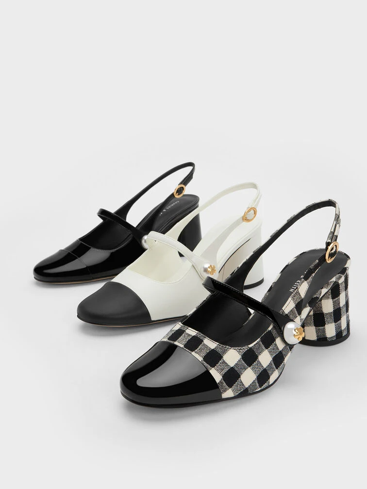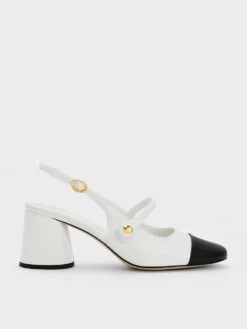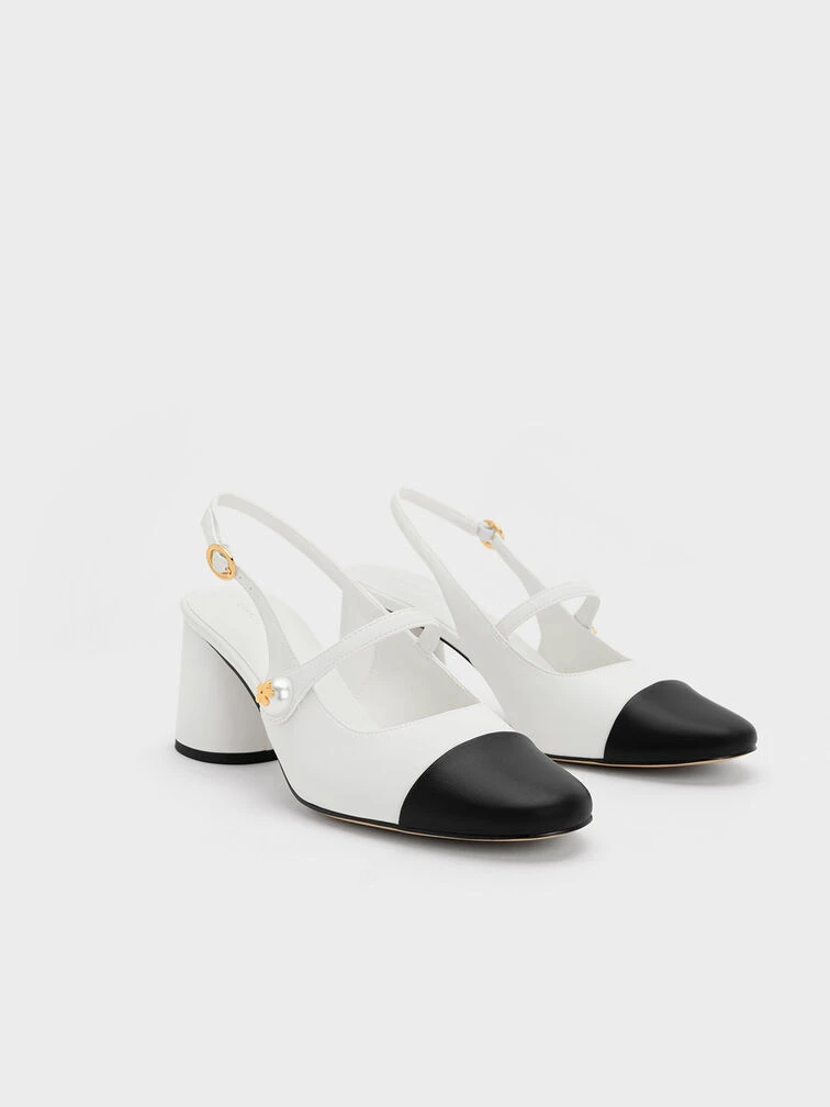 Classic slingback pumps are made anew with contrast toe-caps and Mary Jane straps. Set on dependable cylindrical heels, they strike the balance between function and form. The devil is in the details; the additional straps across the vamps come fitted with pearl-embellished buttons that are adorned with gold-tone floral metallic accents.