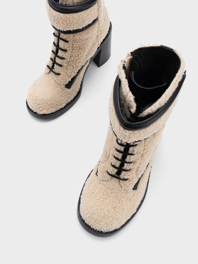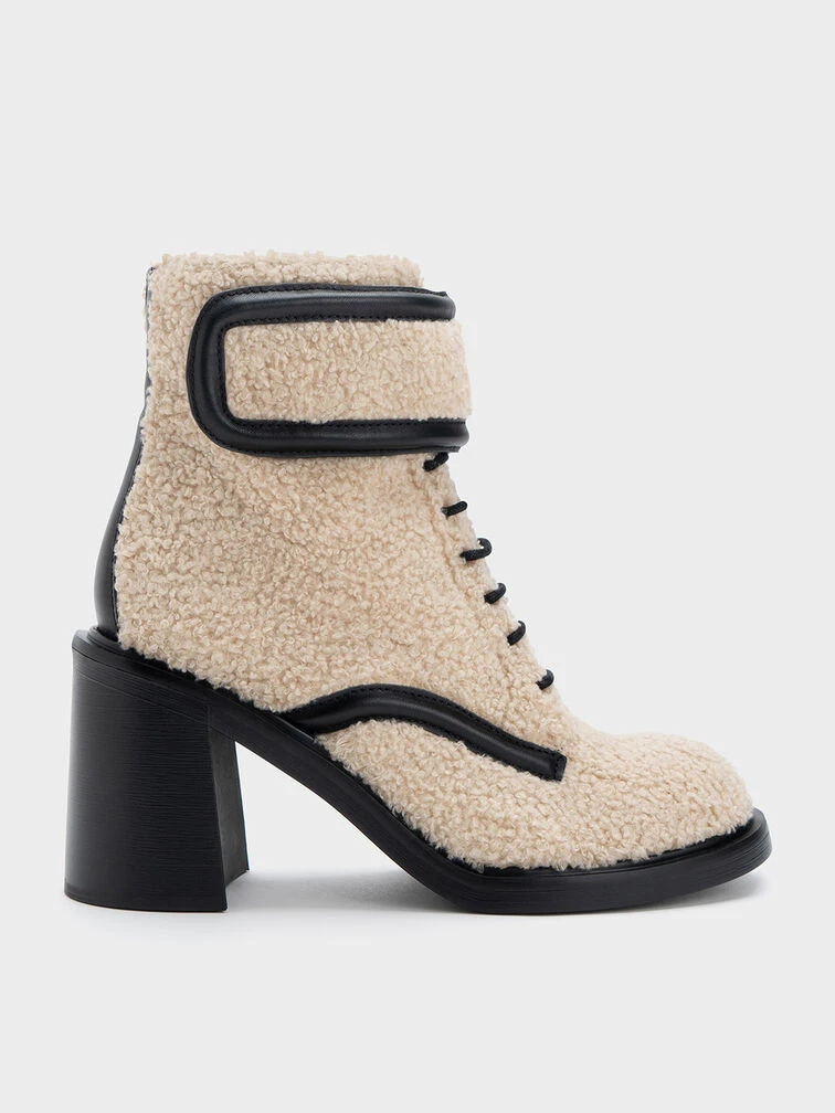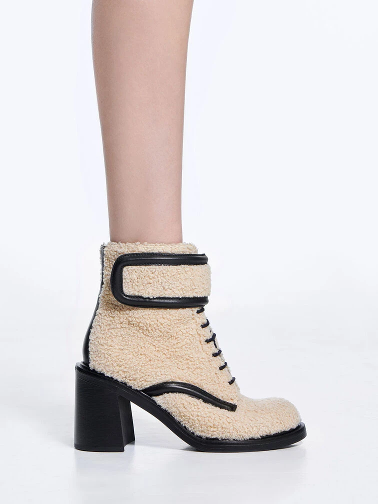 Keep warm in style this season with the Rosalie furry leather ankle boots. Their striking detailing complement the faux shearling finish – black piping outlines the straps that wrap around the ankles, while functional lace-up closures allow you to customise the fit of the boots for comfortable all-day wear. With an elevation of 8.5cm, these boots have a flattering leg-lengthening effect that will bring your fall ensembles to the next level.