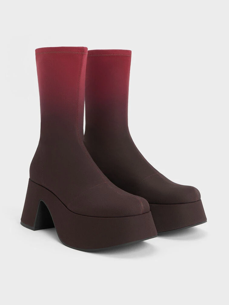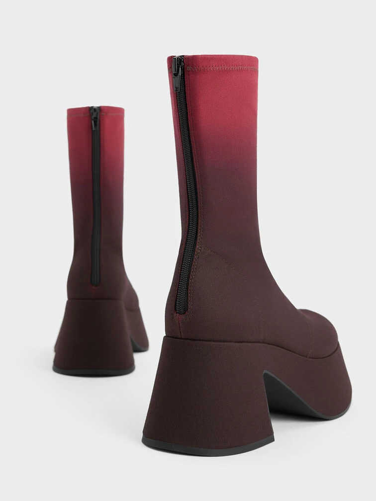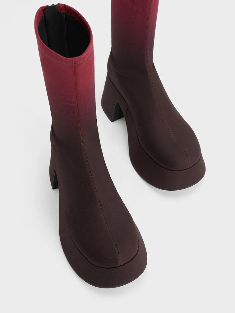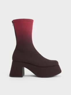 Infuse your looks with a subtly edgy element with these Rubina boots. Red fades into black for a striking yet understated ombre finish that adds visual interest to the minimal boot style. Tapered uppers are balanced out by chunky platform soles for a dynamic silhouette that is still wearable with most outfits – these shoes also offer a flattering height boost. Let these boots refresh all-black ensembles, or complement them with other red accents.
