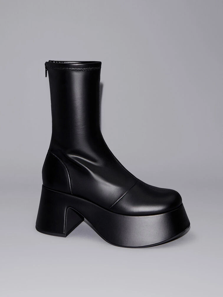Bring the Y2K look into winter with these Rubina boots. With tapered uppers in a sleek black finish, they will accentuate the calves for a flattering fit. To balance out the snugness on the top, chunky platform soles boost stature while maintaining walkability. Wear these to add an instantly edgy element to your winter layers with minimal effort.
