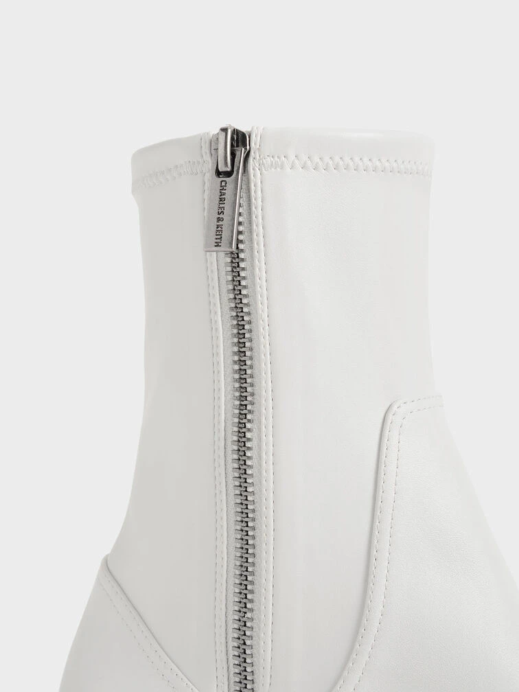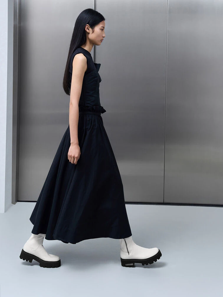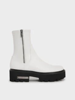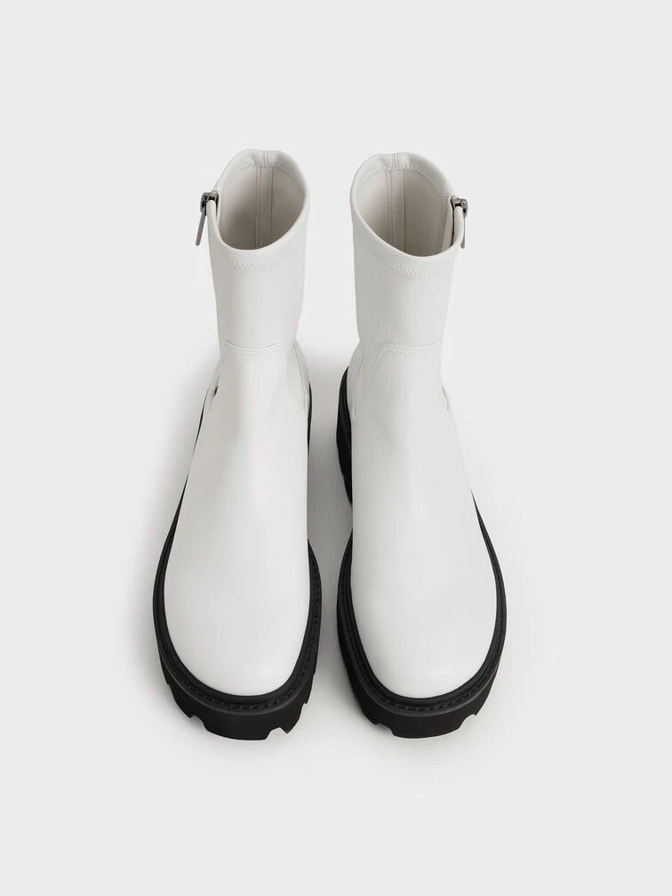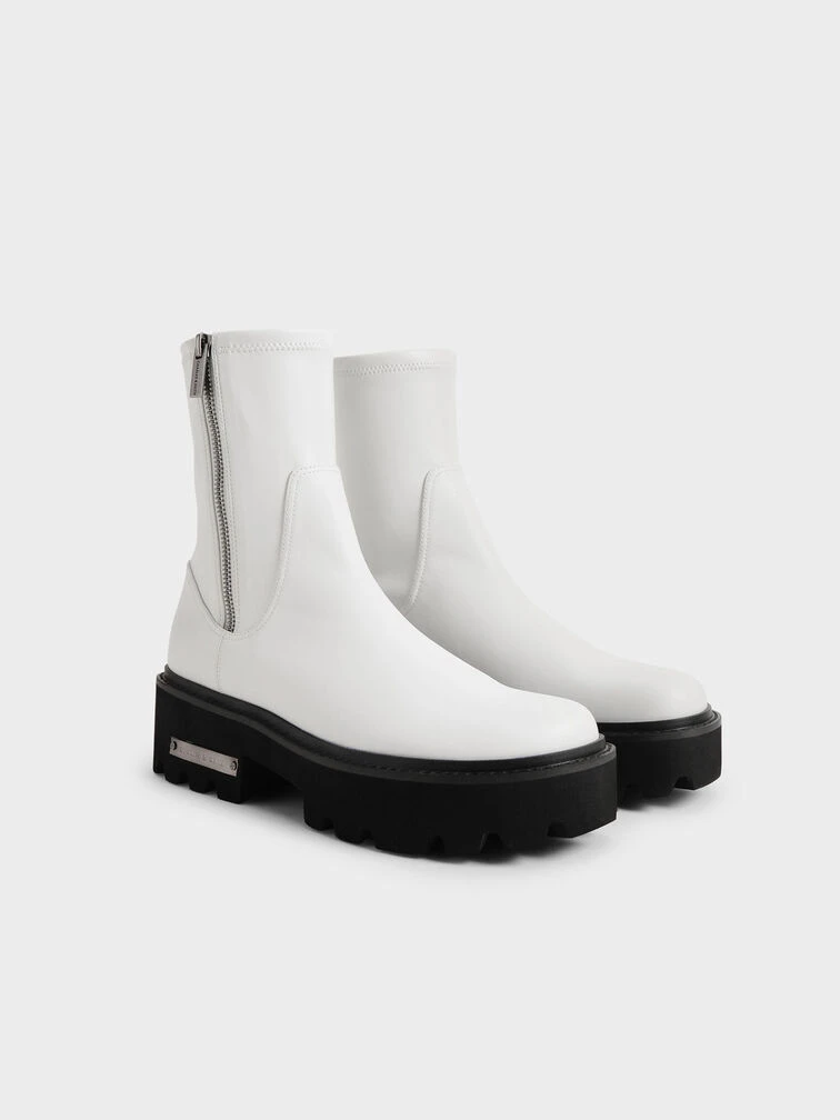Channel your inner edgy fashionista with these ankle boots. With its striking white-and-black colour contrast and bold chunky platform heel, these booties clearly belong in the limelight. Even the side-zip detail does its part, contributing to a modern design while fulfilling functionality. We recommend styling them with a cropped jumpsuit and a sculptural bag for a look that oozes confidence with every step.