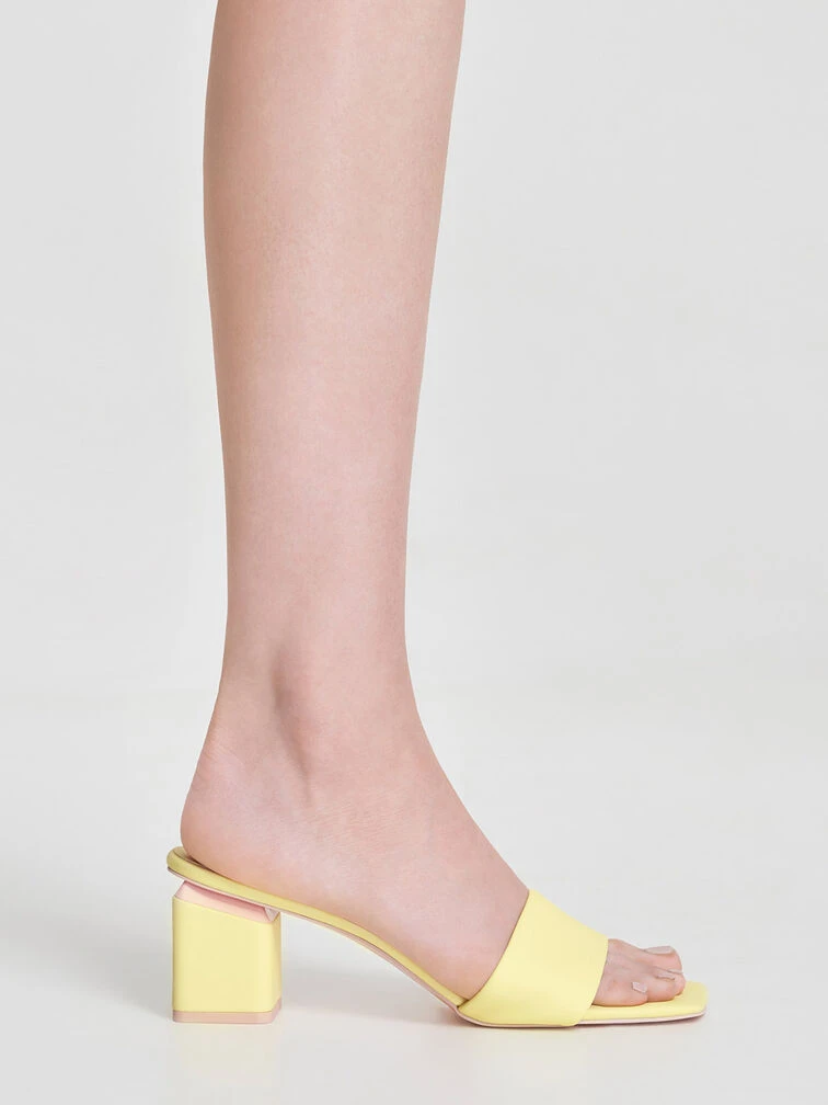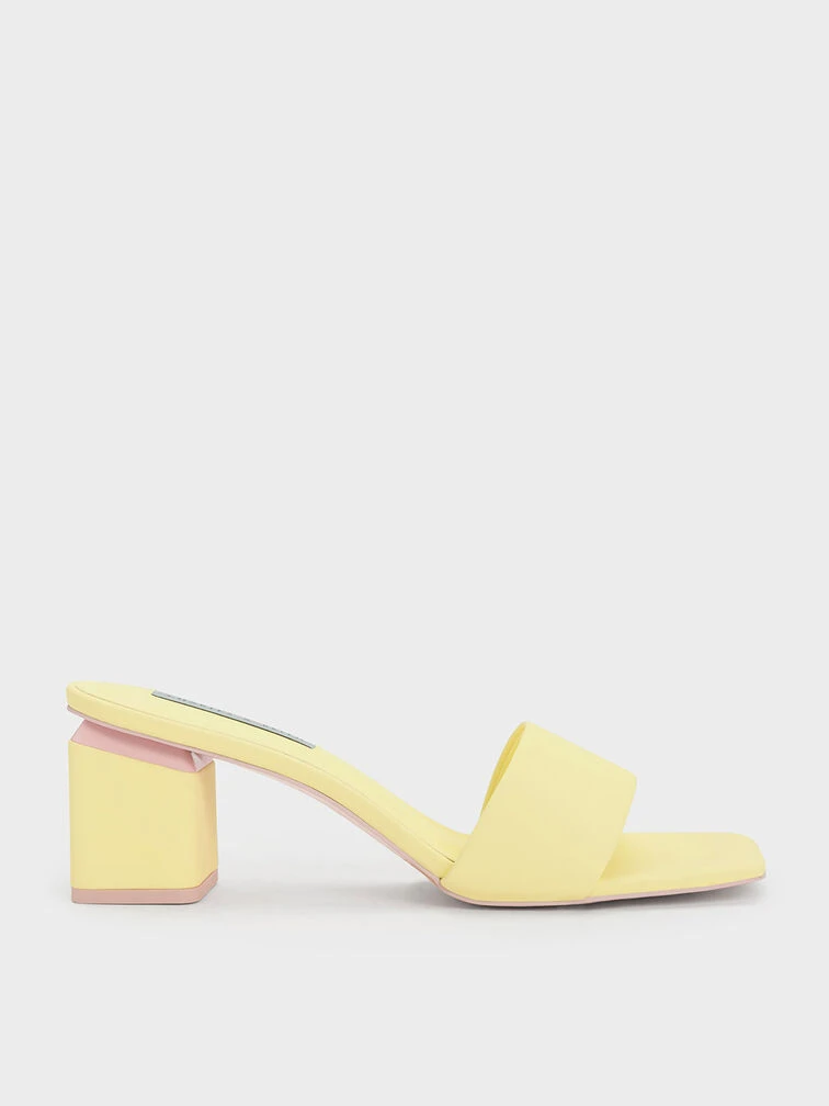 Add a ray of sunshine to your everyday ensembles with these lovely mules in a soft, pastel yellow. Their sleek and simple silhouette lets the bright finish shine, while the open-toed design would allow you to show off your pretty pedicure. Set on 6cm square block heels, they offer a flattering stature boost without sacrificing comfort.
