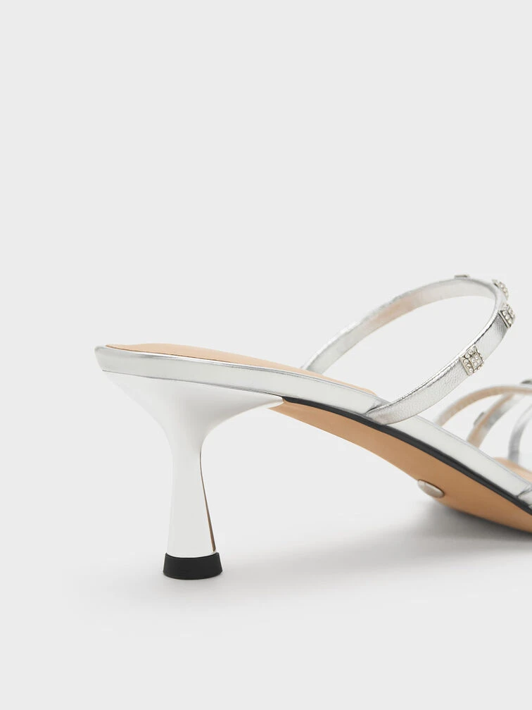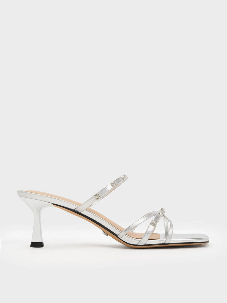 Step into the night with these metallic leather heeled mules, where your toes are free to breathe and you shine like a star wherever you go. The brilliant silver finish of these mules ensures you stand out in any setting. Not just limited to daylight, these mules create a captivating allure even in the dark, making them the perfect choice for a night out filled with glamour. Their straps are adorned with unique square-shaped crystals that complement the silver, creating a harmonious and sophisticated design.