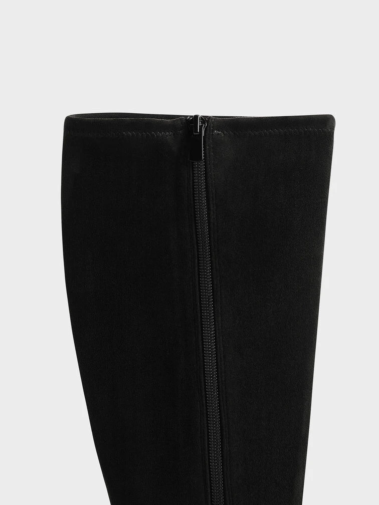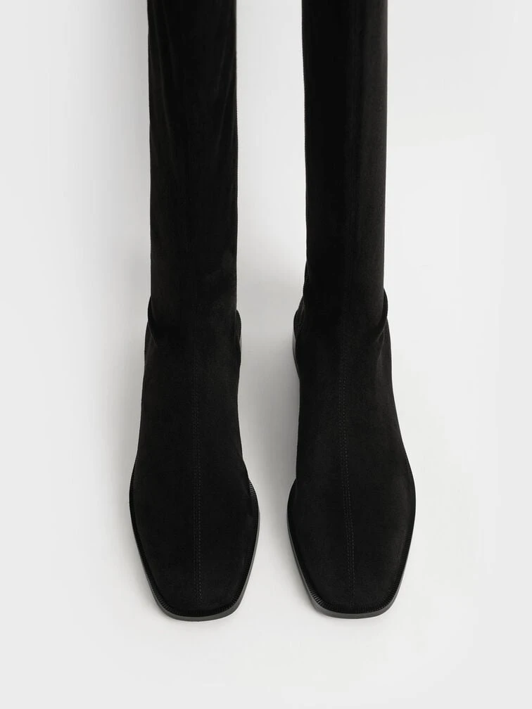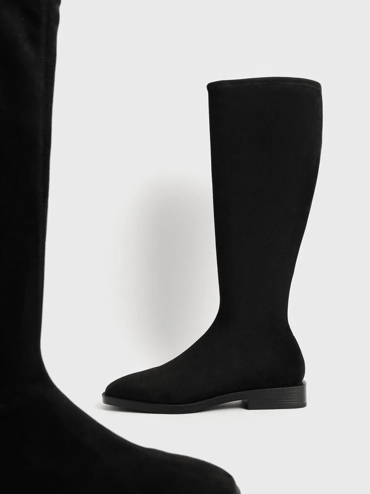 Strut your stuff in these boots. The knee-high length and square toe design will make sure you look sophisticated and chic, whilst the black faux suede offers a smooth and classy finish. Set on a low 2.5cm flat heel, long days will feel a little bit shorter when you have these boots on. We recommend matching them with a floral dress and a double handle tote bag for a graceful look.