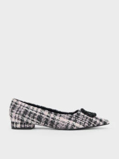 Featuring a visually interesting black-and-pink tweed finish, this bold iteration of our beaded circle flats are perfect for showing off your impeccable sense of style. These shoes have all the makings of a wardrobe favourite – from the barely-there 2cm block heels and sleek pointed-toed silhouette to the eye-catching beaded circle embellishments across the vamps, they are perfect for jazzing up your workwear rotation.