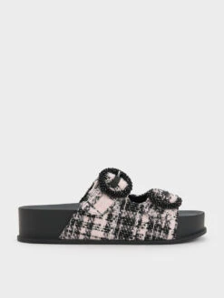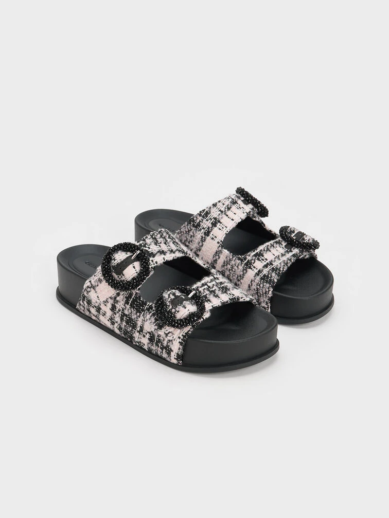 Level up your style game with the tweed version of our beaded circle sandals. Juxtaposing an eye-catching pink and black tweed finish against a classic black base and matching beaded circle embellishments along the adjustable buckled straps, these shoes stand out in all the right ways. Featuring 4.5cm tall platform soles, these slides are easy to slip on and are comfortable enough to walk in all day long.