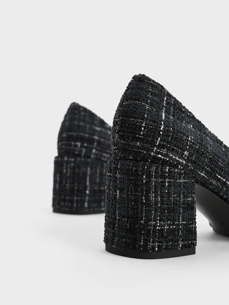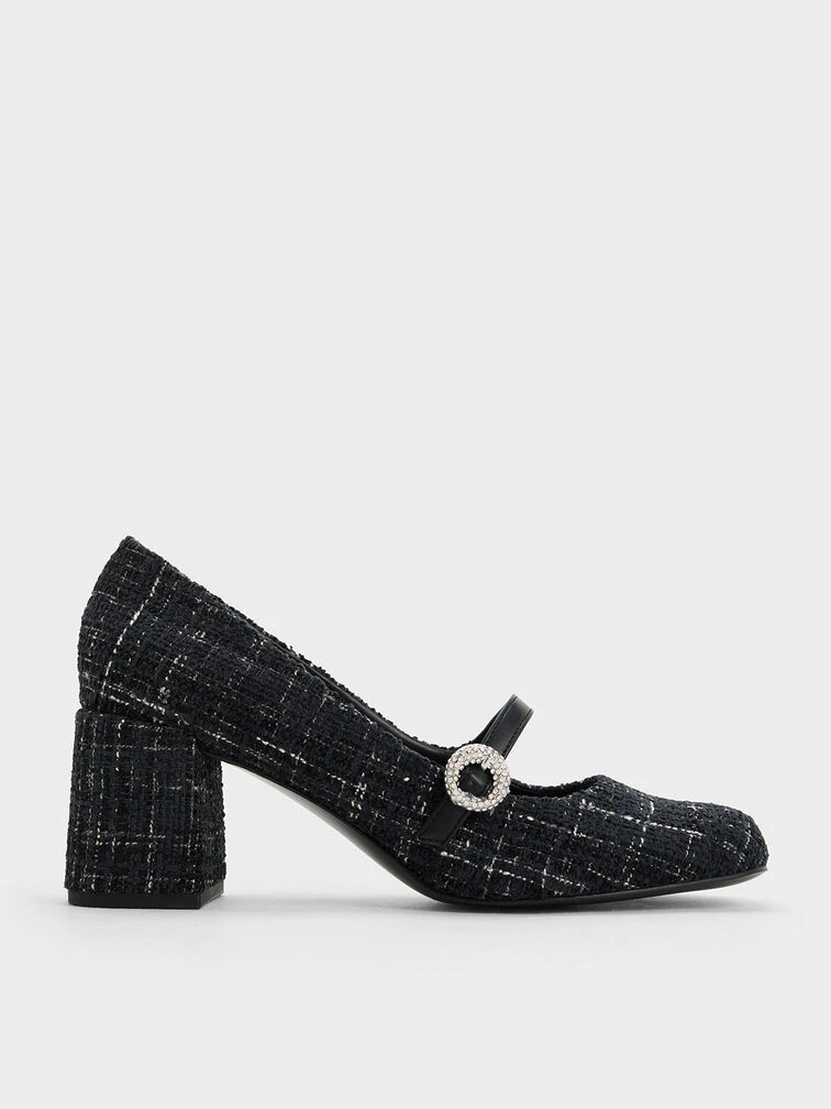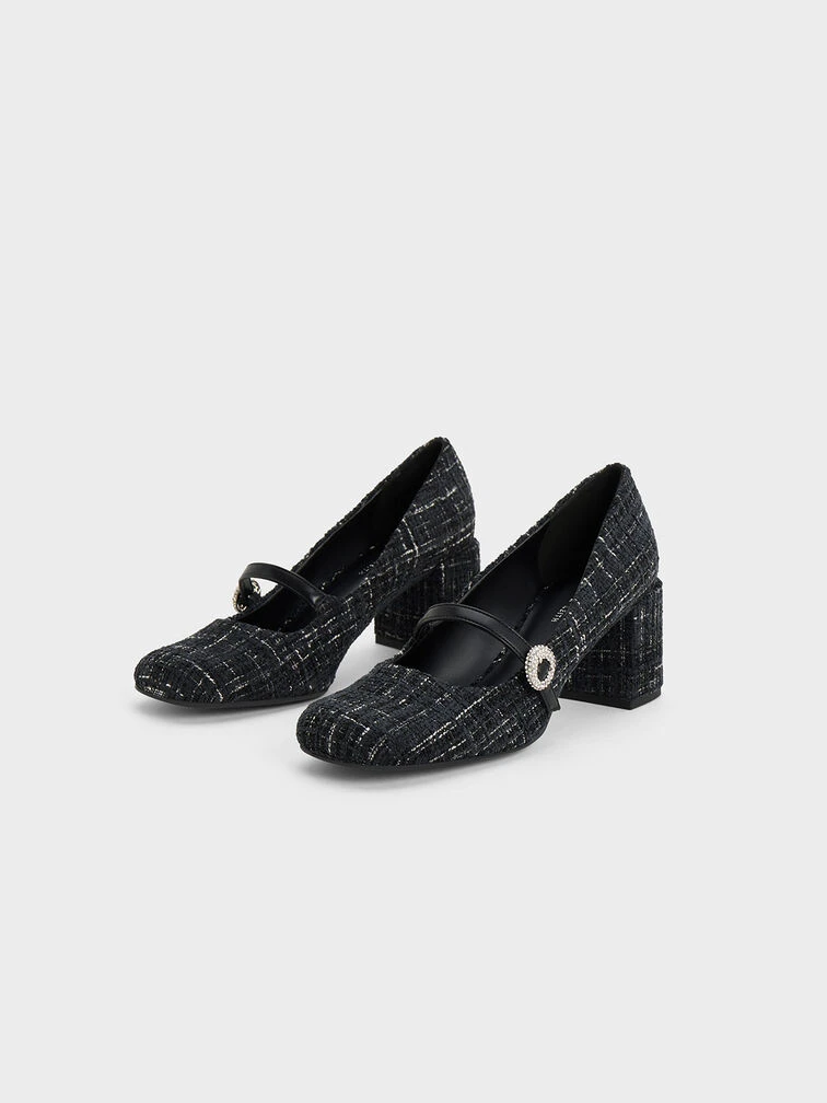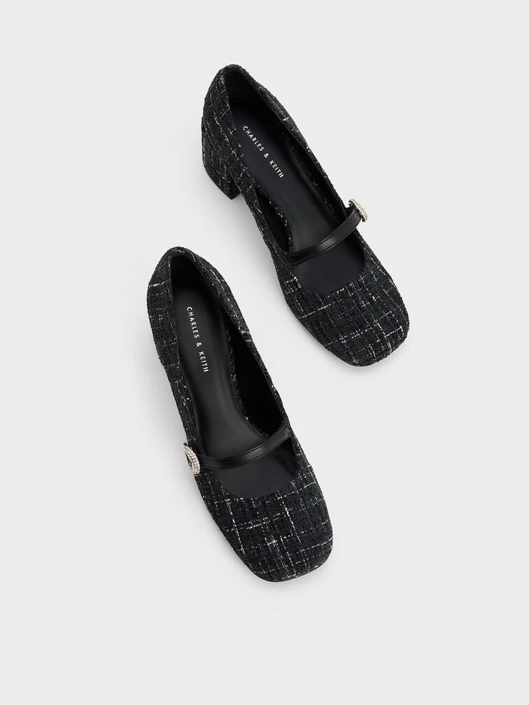 On days when you seek to elevate your style with effortless sophistication, these Mary Jane pumps are the perfect choice. Featuring a gorgeous tweed black finish, subtly adorned with white specks, they add visual intrigue without being too flashy. They also feature crystal-embellished buckles that are discreetly positioned on the side of the strap as a finishing flourish, imparting the design with a dainty charm.
