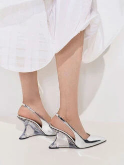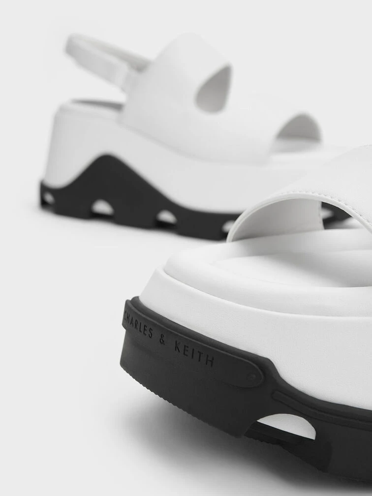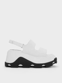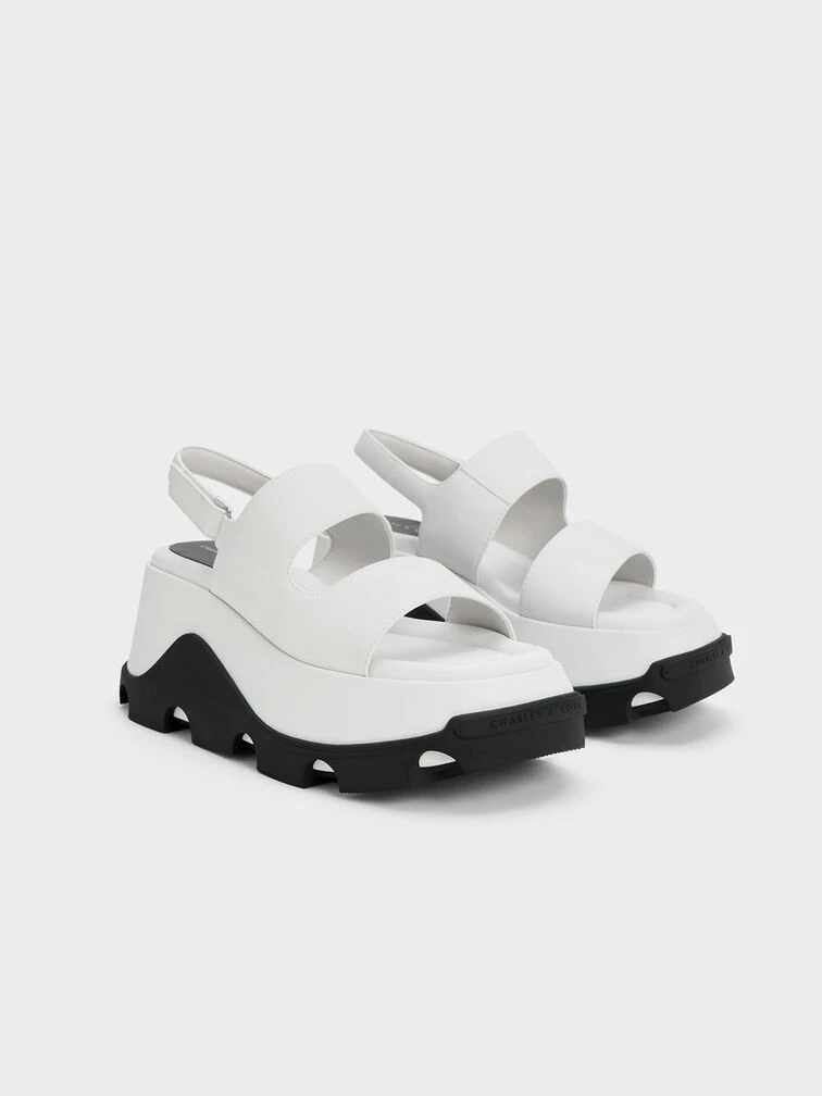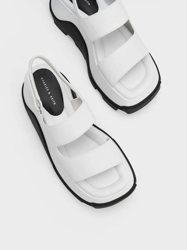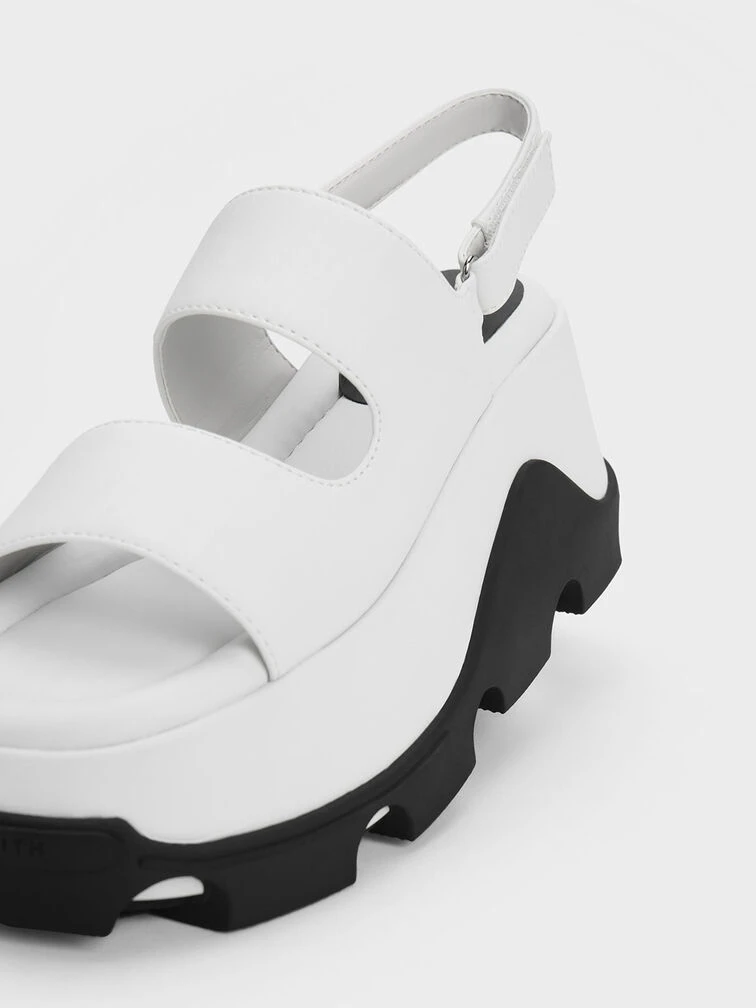 Level up your style game with these two-toned asymmetric platform sandals. Featuring a distinctive white finish with attention-grabbing black curved serrated sole details, these shoes are set to turn heads wherever you go. Set on 8cm flatform soles for a stable height boost, they also come with adjustable ankle straps for a customised and comfortable fit.